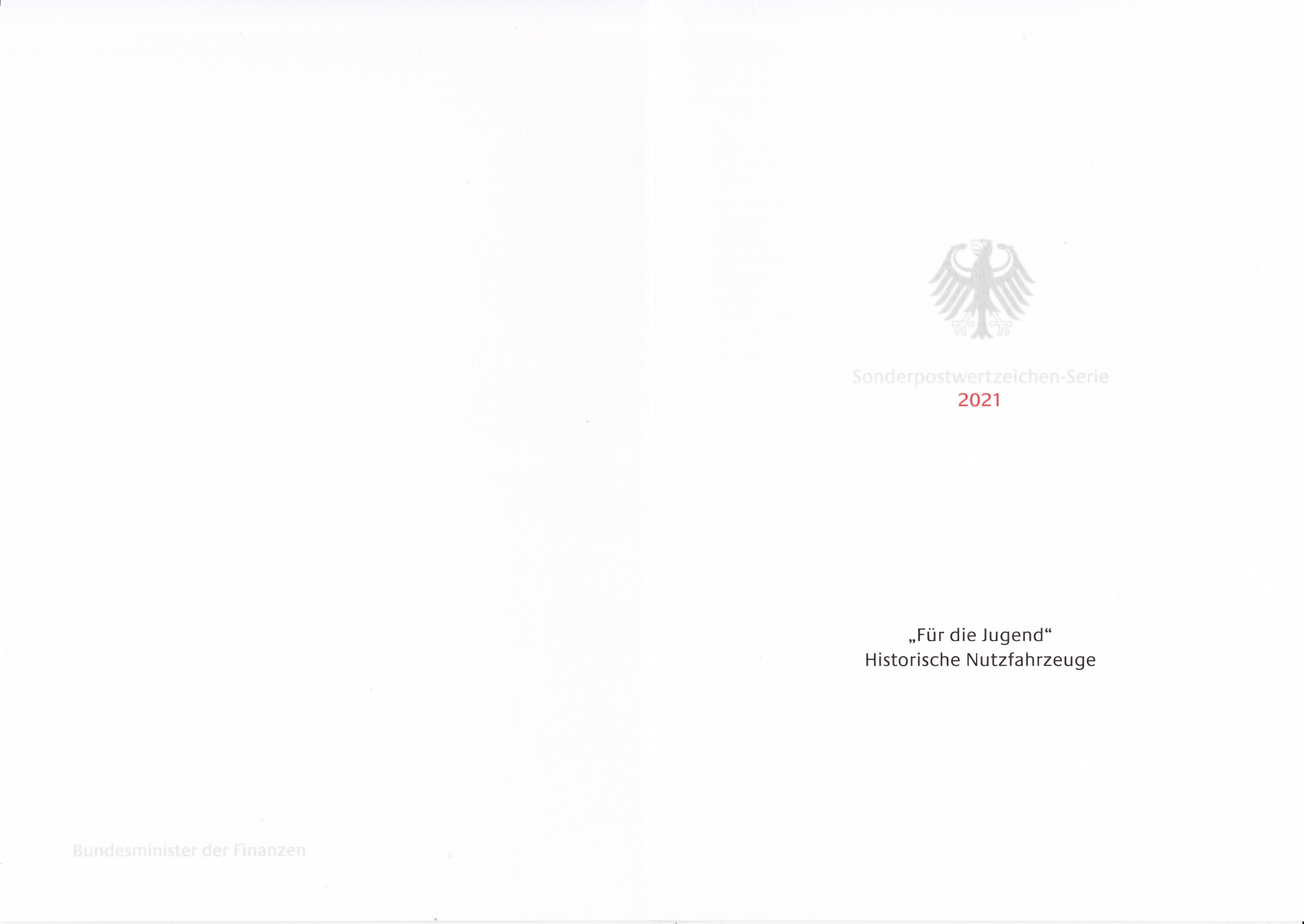 Ministerkarte des Finanzministers mit je einer Marke für die Jugend 2021 (MiNr 3618 bis 3620) mit Motiven zum Thema "Historische Traktoren". Zwei Marken sind mit den Ersttagsonderstempel Berlin gestempelt und eine Marke erhielt den Ersttagsonderstempel Bonn.
