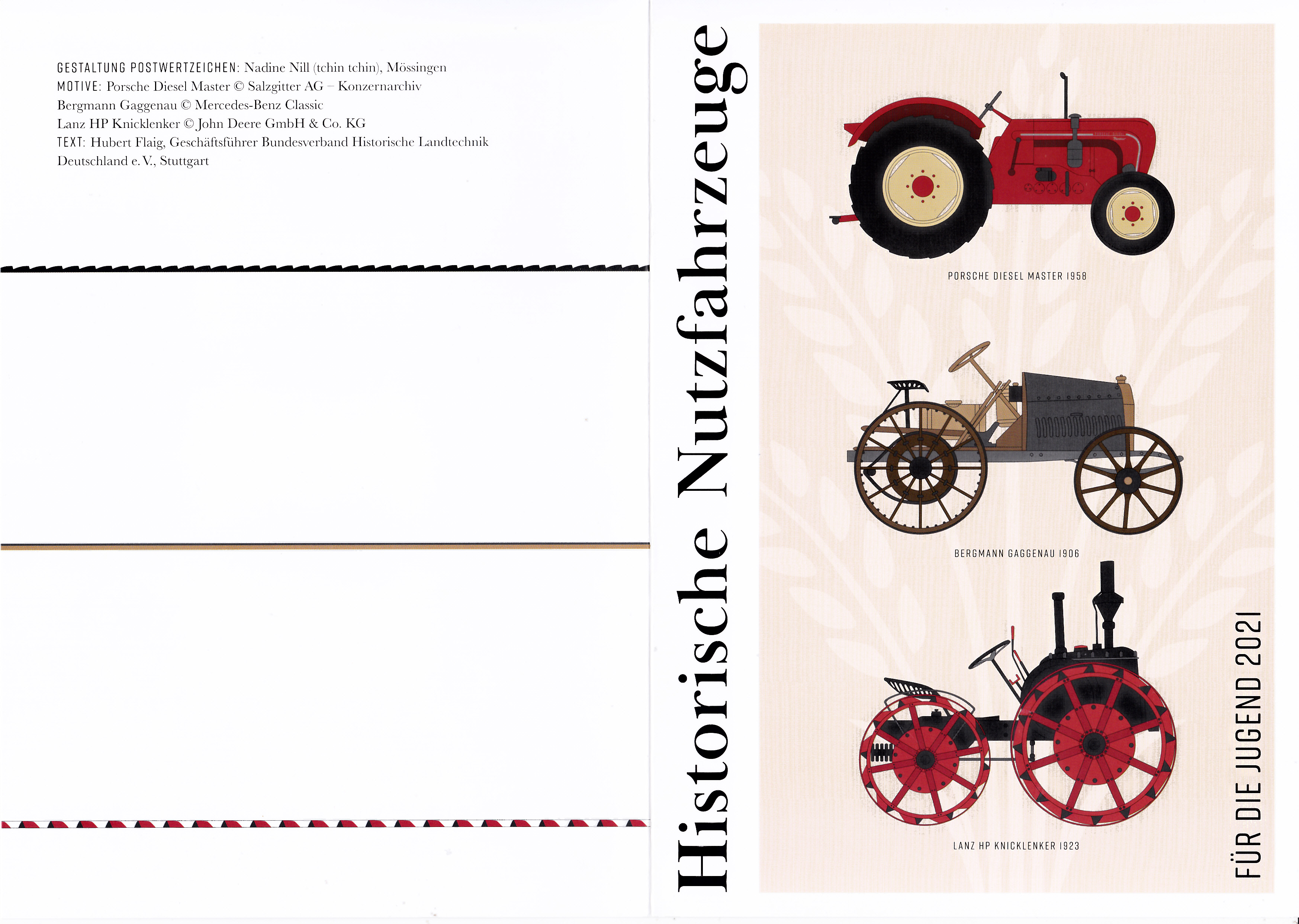 Klappkarte des Vorstandsvorsitzenden der Deutschen Post AG mit je einer Marke für die Jugend 2021 (MiNr 3618 bis 3620) mit Motiven zum Thema "Historische Traktoren" und dem Ersttagsonderstempel Bonn.