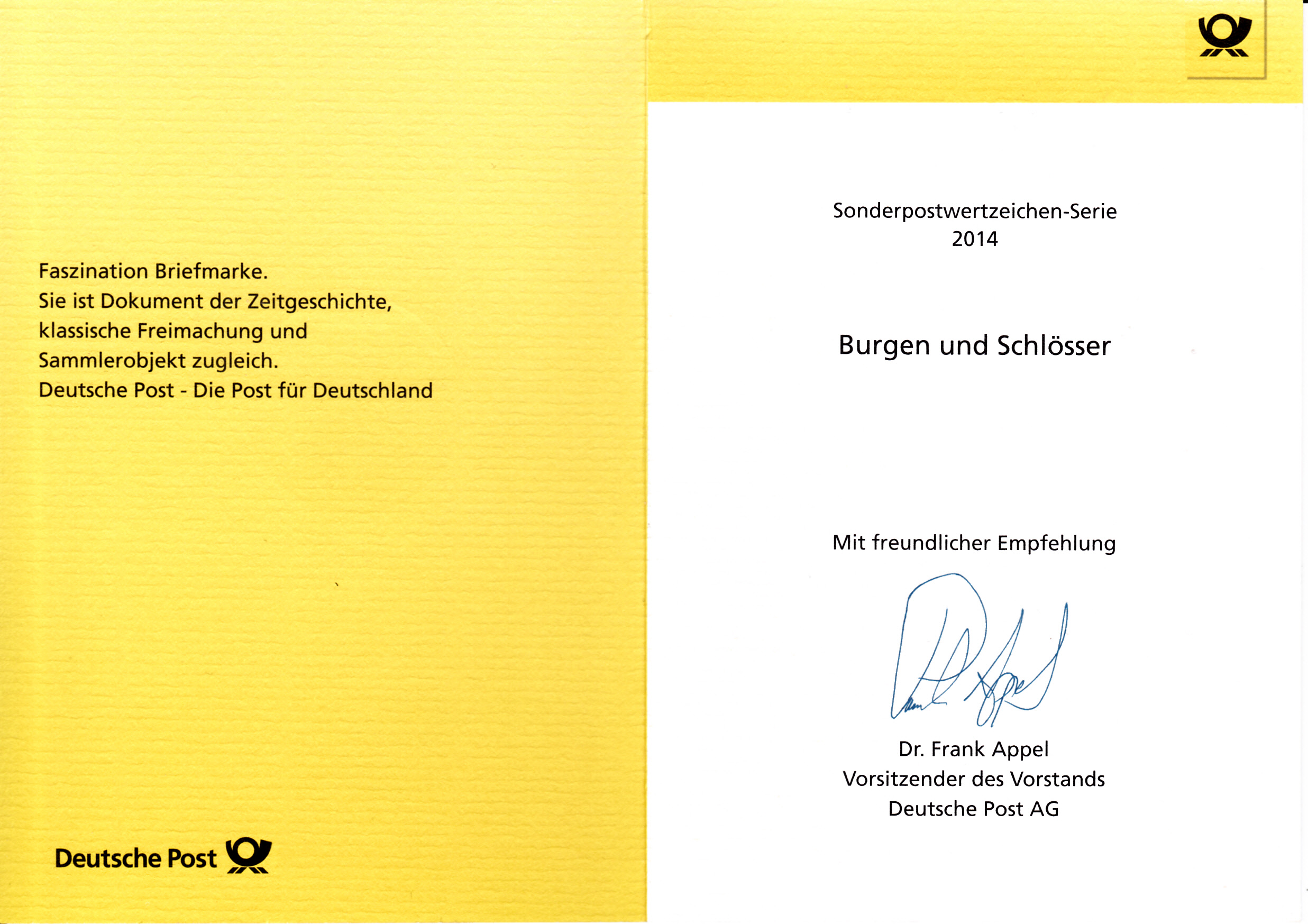 Klappkarte des Vorstandsvorsitzenden der Deutschen Post AG mit der Marke der Deutschen Post (MiNr 3062) "Albrechtsburg in Meißen" aus der Serie "Burgen und Schlösser" und dem Ersttagsonderstempel Bonn.