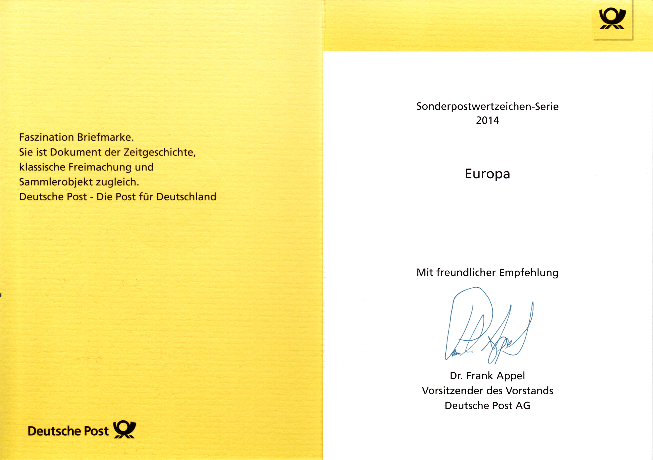 Klappkarte des Vorstandsvorsitzenden der Deutschen Post AG mit der Europamarke der Deutschen Post (MiNr 3078) mit der Abbildung einer Klarinette und dem Ersttagsonderstempel Bonn.