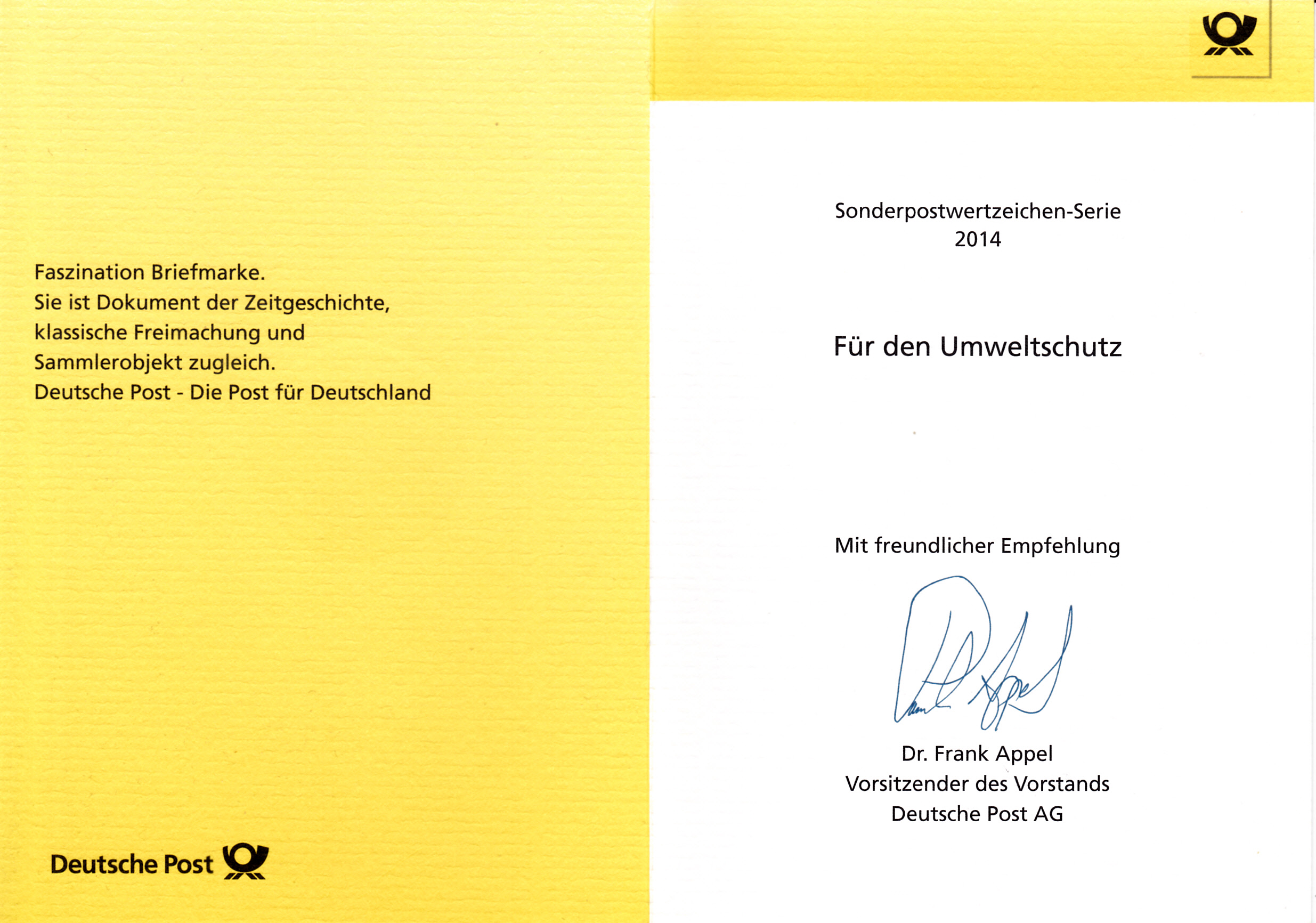 Klappkarte des Vorstandsvorsitzenden der Deutschen Post AG mit der Marke der Deutschen Post (MiNr 3052) "Alte Buchenwälder Deutschlands" und dem Ersttagsonderstempel Bonn.