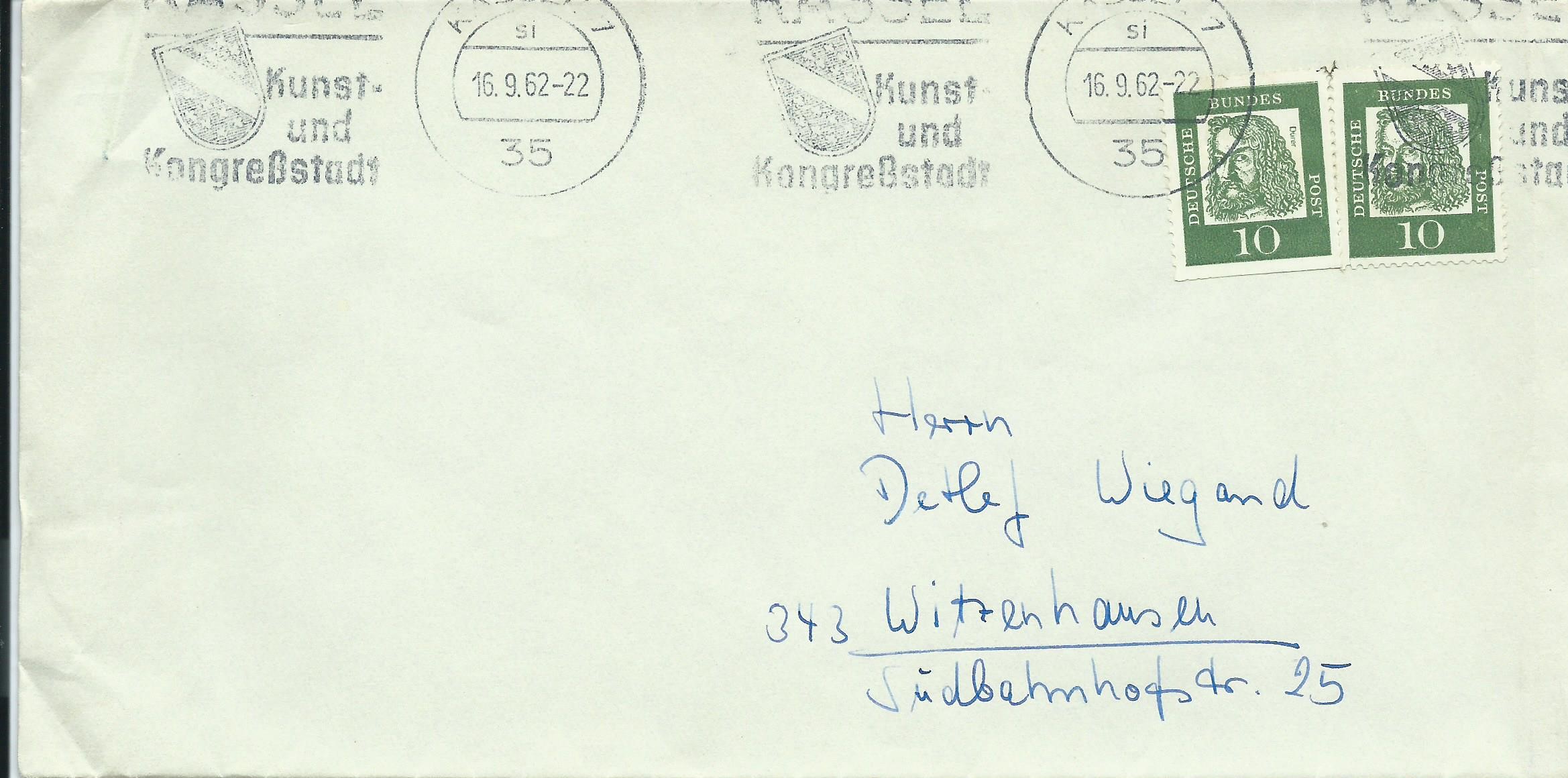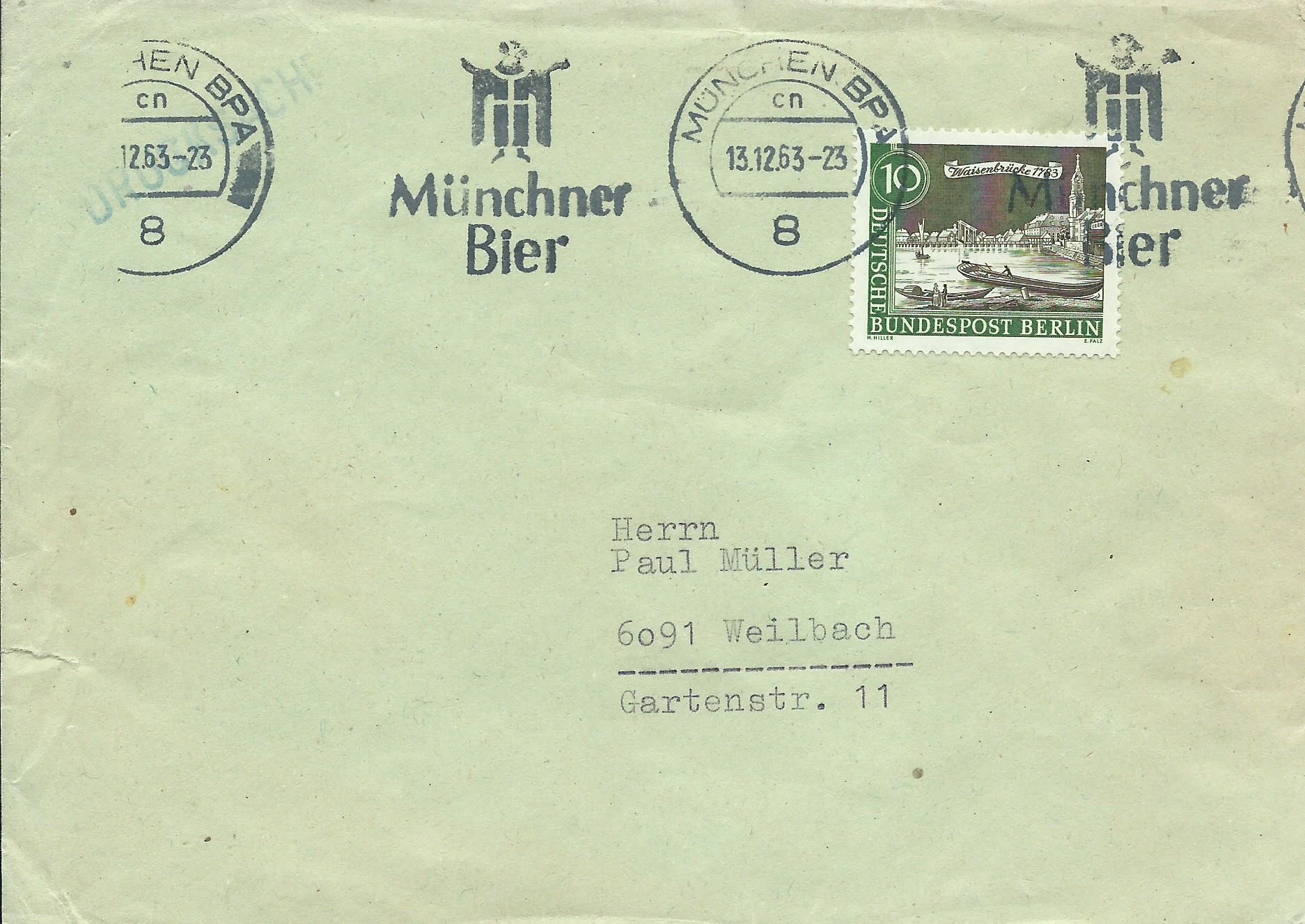 Und gleich noch eine Besonderheit hinterher, die mir eben erst bei der Bildbearbeitung aufgefallen ist. Ich habe seinerzeit einfach nur auf die „langen“ Stempel geachtet und alle auf die Seite gelegt, da habe ich die Tagesstempel nicht weiter beachtet. Aber schaut man sich den hier von Bremen 5 mal genauer an, dann sieht man die merkwürdige Form der Buchstaben und Zahlen. Die Datumszeile 20.5.63 ist noch normal wie in anderen Stempeln auch, aber der Ortsname und die Postleitzahl sind erheblich größer als in gewohnten Stempeln. Ein klarer Fall für meine spezielle Stempelsammlung! Der Werbeeinsatz übrigens wirbt für „Bremen lohnt immer“, das kann man in diesem Falle absolut nur bestätigen!
