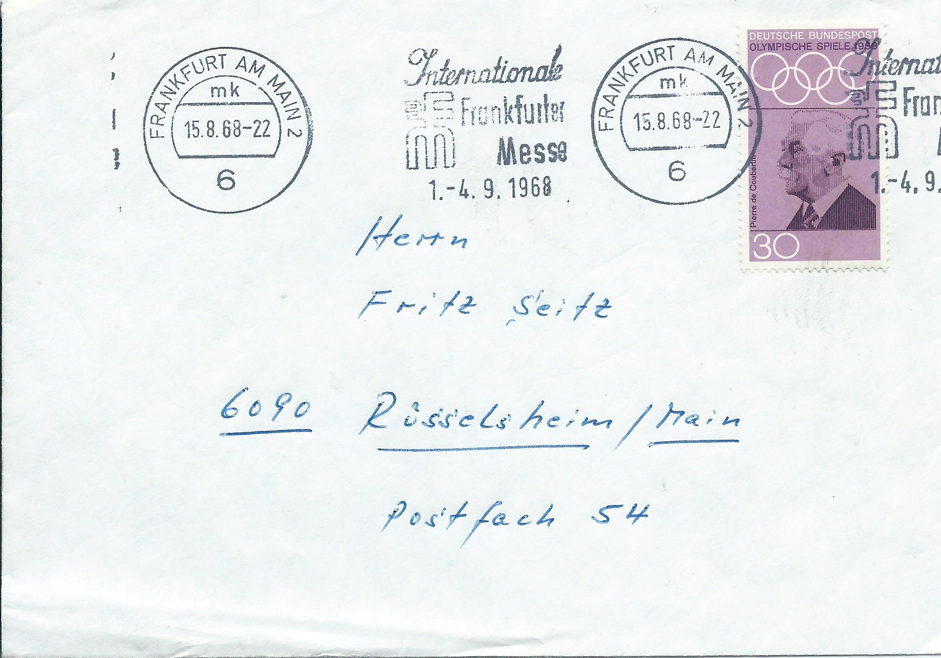 Hier kommt eine Besonderheit: In Ludwigshafen am Rhein waren am 23.12.68 gleich 2 verschiedene Werbeeinsätze in der Maschine. Zum einen „Der Hausbriefkasten gehört dazu“ und zum anderen "Stets gut informiert durch den Ansagedienst der Deutschen Bundespost". Leider ist die Marke beschädigt, aber der Beleg eignet sich trotzdem zur Stempeldokumentation.
