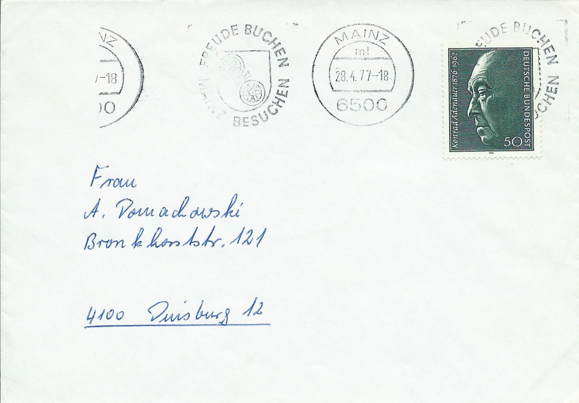 weiter geht es mit einigen Bandstempeln: Mainz wirbt am 28.4.77 mit dem Werbeeinsatz „Freude buchen, Mainz besuchen“: