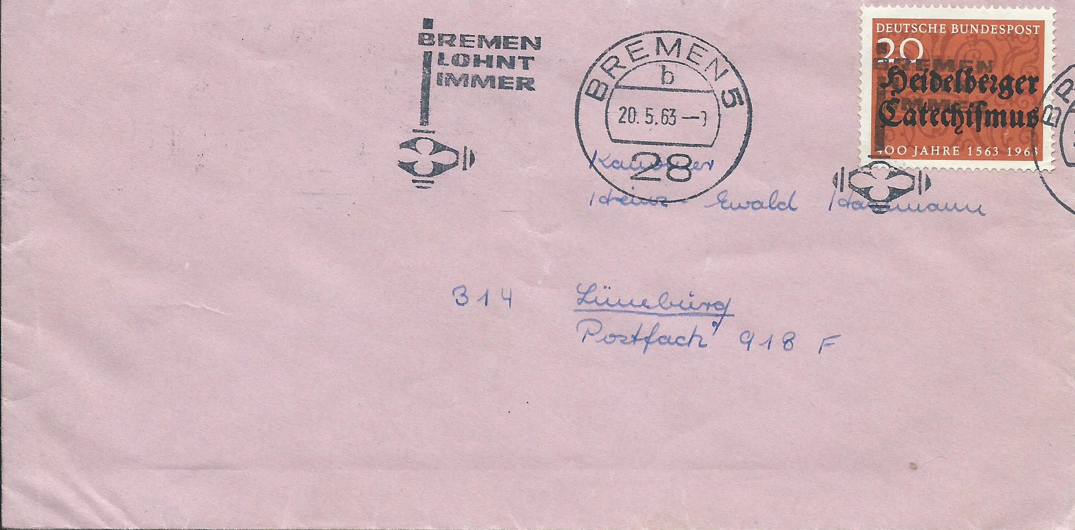 Und der gleiche Stempeltyp noch einmal hinterher, hier vom 19.8.63. Hier wird für die Ausstellung Bremen ´63 geworben.