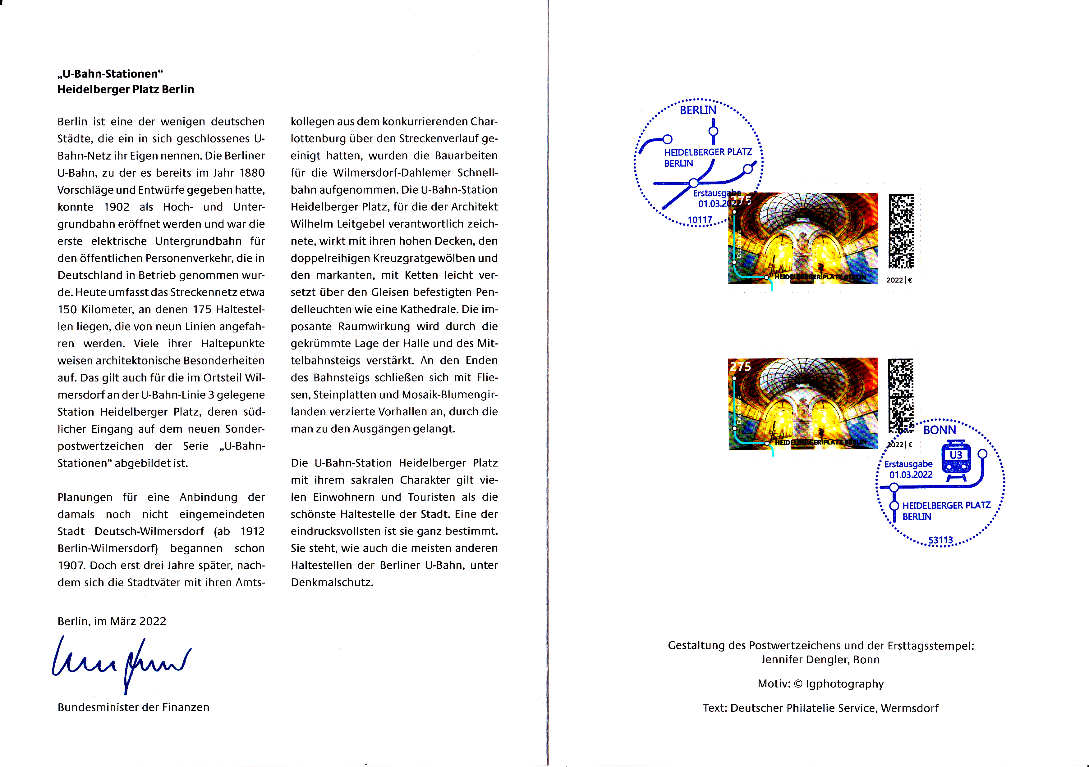 Ministerkarte des Finanzministers mit zwei Marken der Serie "U-Bahn-Stationen" mit dem Motiv "U-Bahn-Haltestelle Heidelberger Platz, Berlin" (MiNr 3674) und den beiden Ersttagsonderstempel Bonn und Berlin.