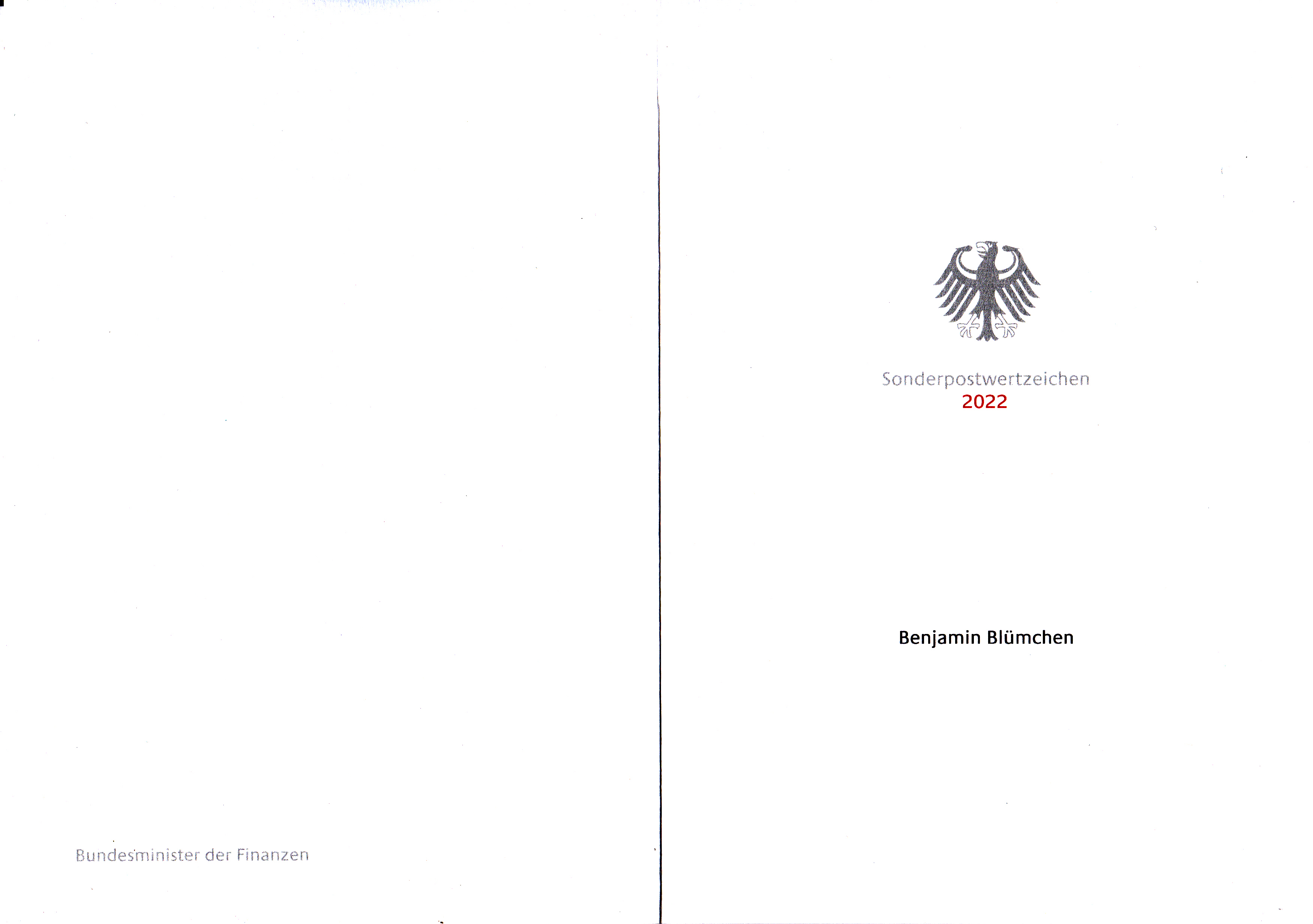 Ministerkarte des Finanzministers mit den drei Wohlfahrtsmarken 2022 (MiNr 3464 bis 3466) mit Motiven zu Grimms Märchen "Rumpelstilzchen" und den beiden Ersttagsonderstempel Bonn und Berlin.