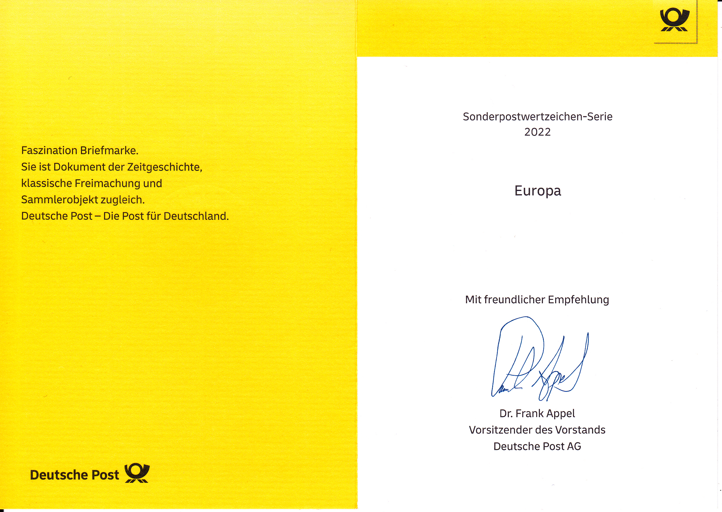 Klappkarte des Vorstandsvorsitzenden der Deutschen Post AG mit der Europamarke 2022 (MiNr 3687)mit der Abbildung "Ritter kämpft gegen dreiköpfigen Drachen" und dem Ersttagsonderstempel Bonn.