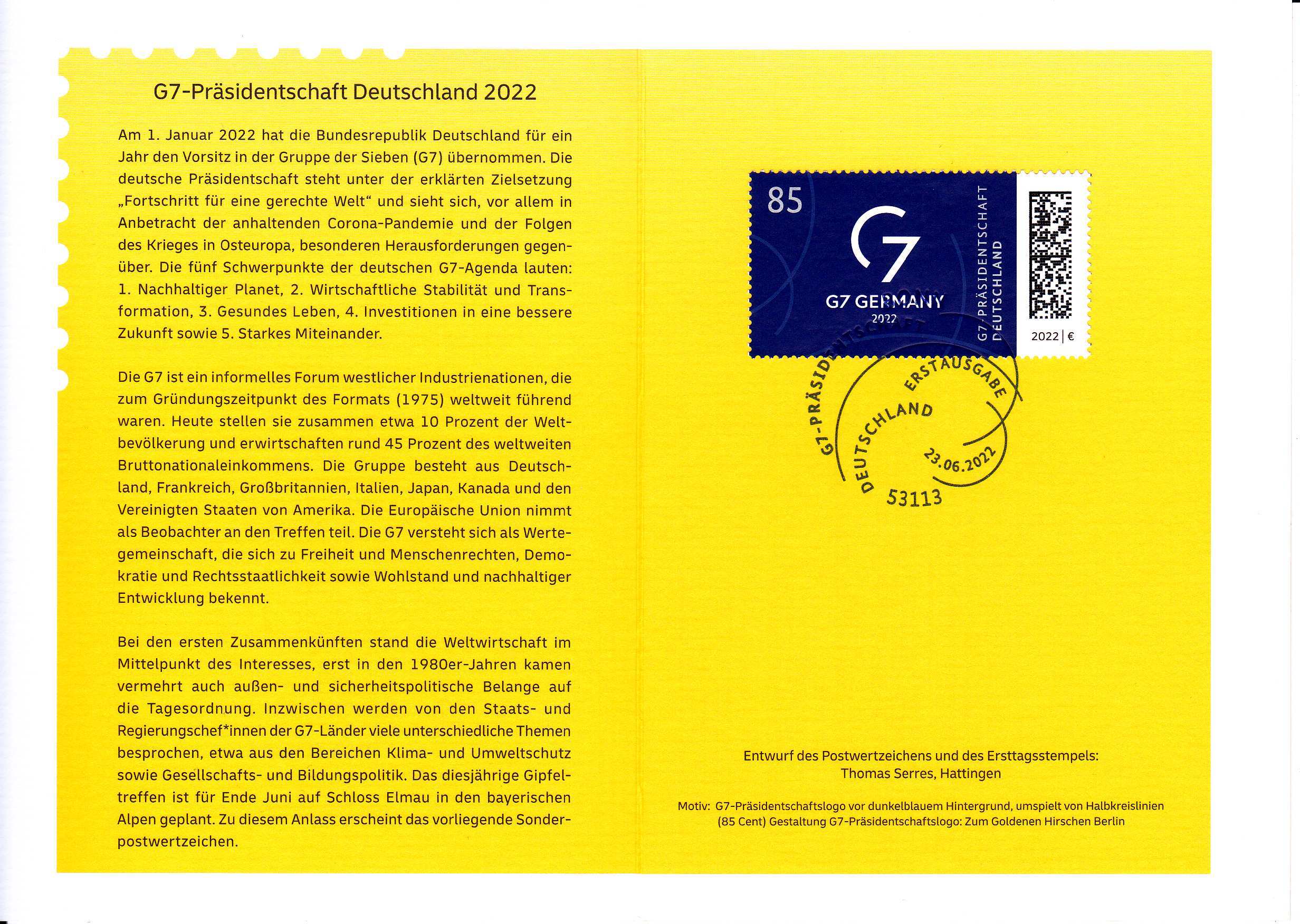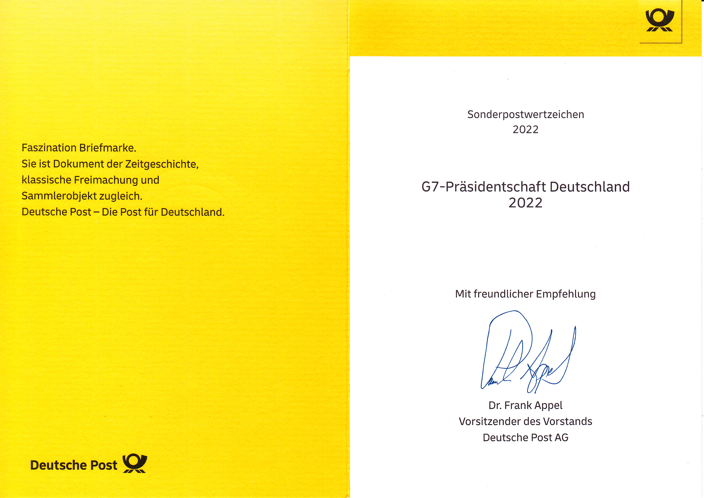 Klappkarte des Vorstandsvorsitzenden der Deutschen Post AG mit der Marke (MiNr 3694) "G7-Präsidentschaft Deutschlands 2022" und dem Ersttagsonderstempel Bonn.