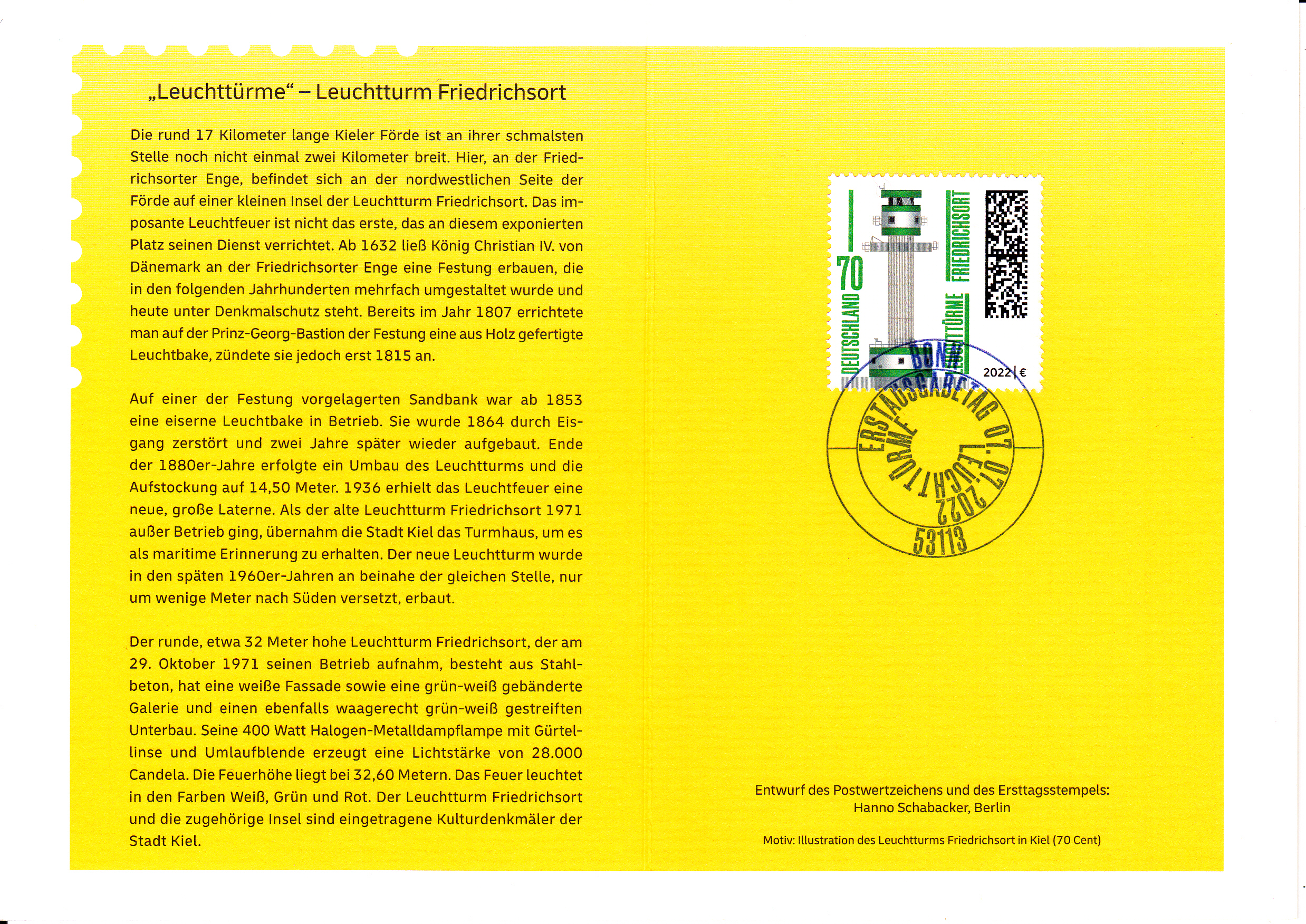 Klappkarte des Vorstandsvorsitzenden der Deutschen Post AG mit der Marke der Deutschen Post (MiNr 3696) aus der Serie "Leuchttürme" mit dem Motiv "Leuchtturm Friedrichsort" und dem Ersttagsonderstempel Bonn.