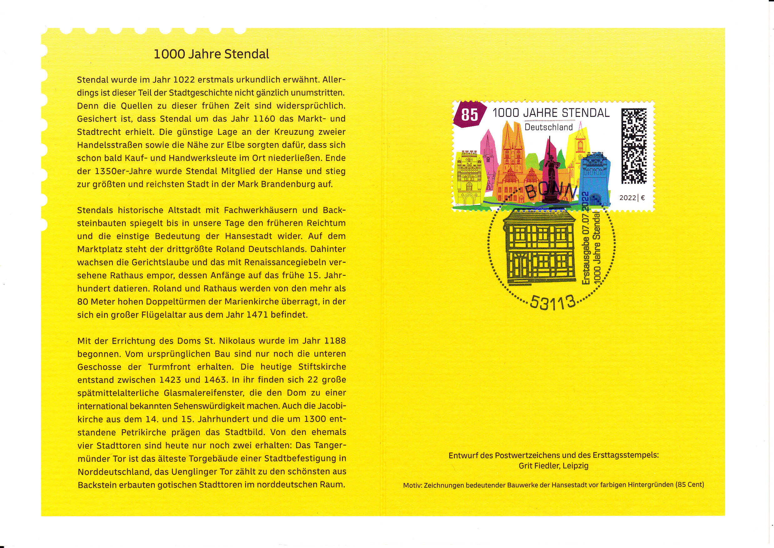 Klappkarte des Vorstandsvorsitzenden der Deutschen Post AG mit der Marke (MiNr 3698) "1000 Jahre Stendal" und dem Ersttagsonderstempel Bonn.