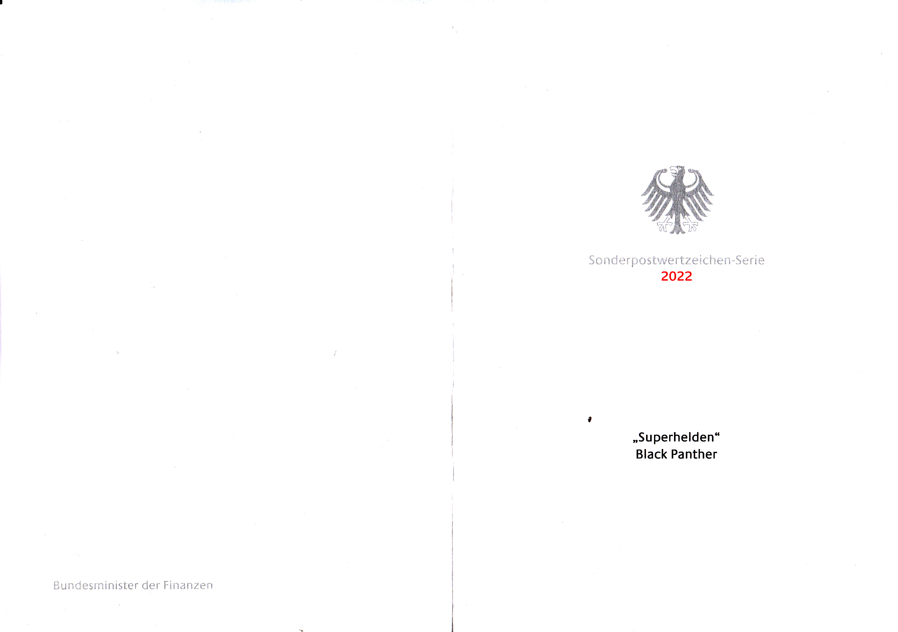 Ministerkarte des Bundesministers für Finanzen mit zwei Marken (MiNr 3720) aus der Serie "Superhelden" mit dem Motiv "Black Panther in Kampfstellung" und den beiden Ersttagsonderstempel Bonn und Berlin.