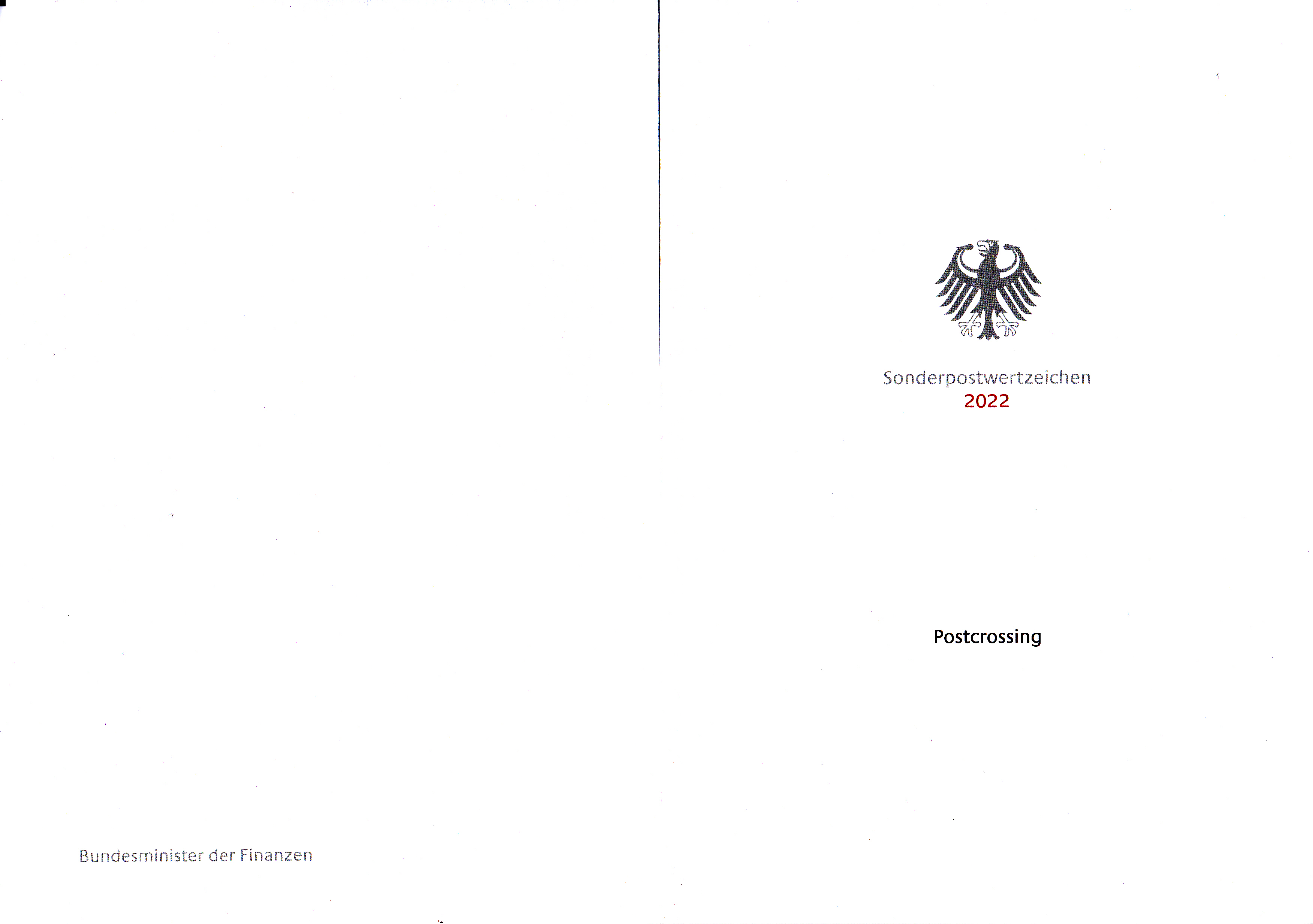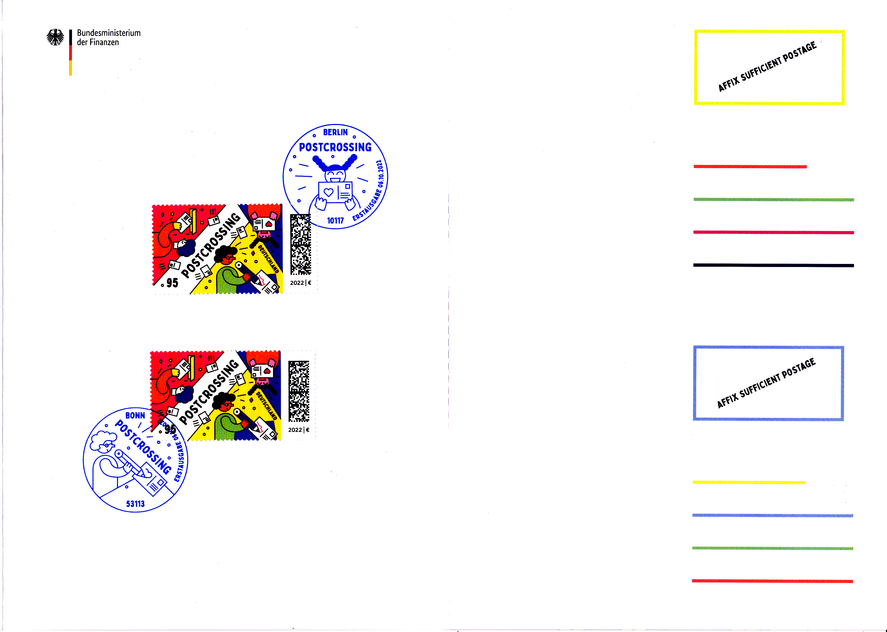 Farbige Ministerkarte des Bundesministers für Finanzen mit zwei Marken (MiNr 3722) zum Thema "Postcrossing" und den beiden Ersttagsonderstempel Bonn und Berlin.