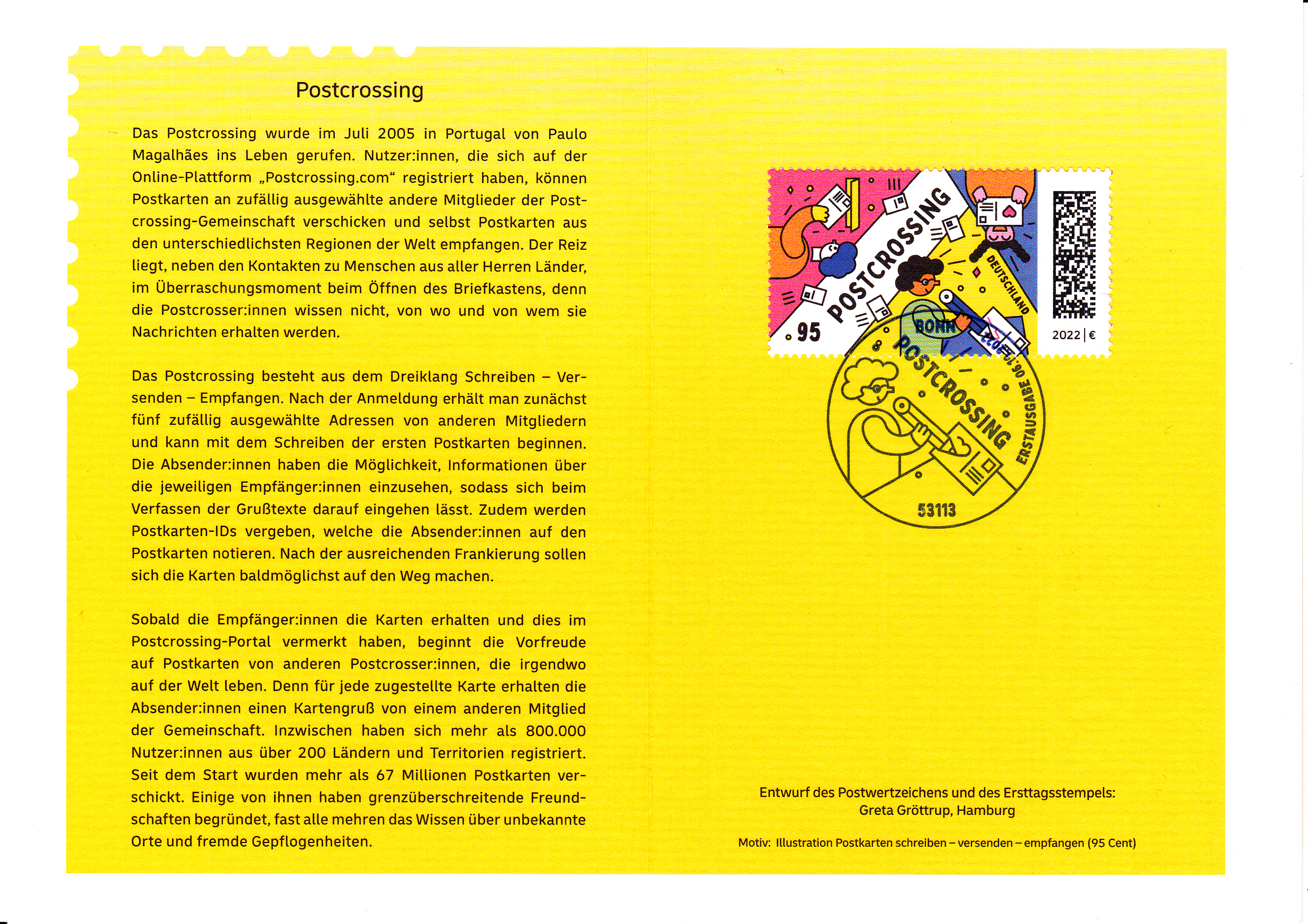 Klappkarte des Vorstandsvorsitzenden der Deutschen Post AG mit einer Marke (MiNr 3722) zum Thema "Postcrossing" und dem Ersttagsonderstempel Bonn.