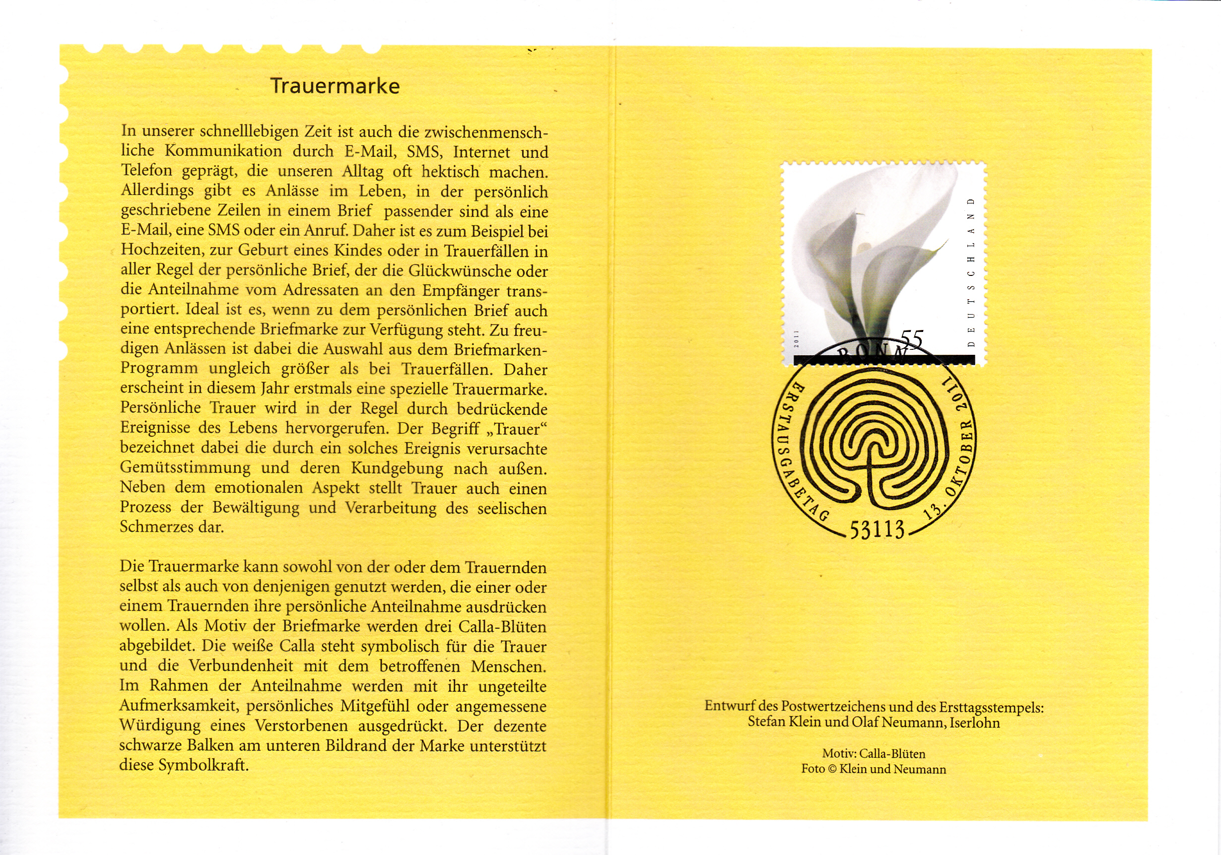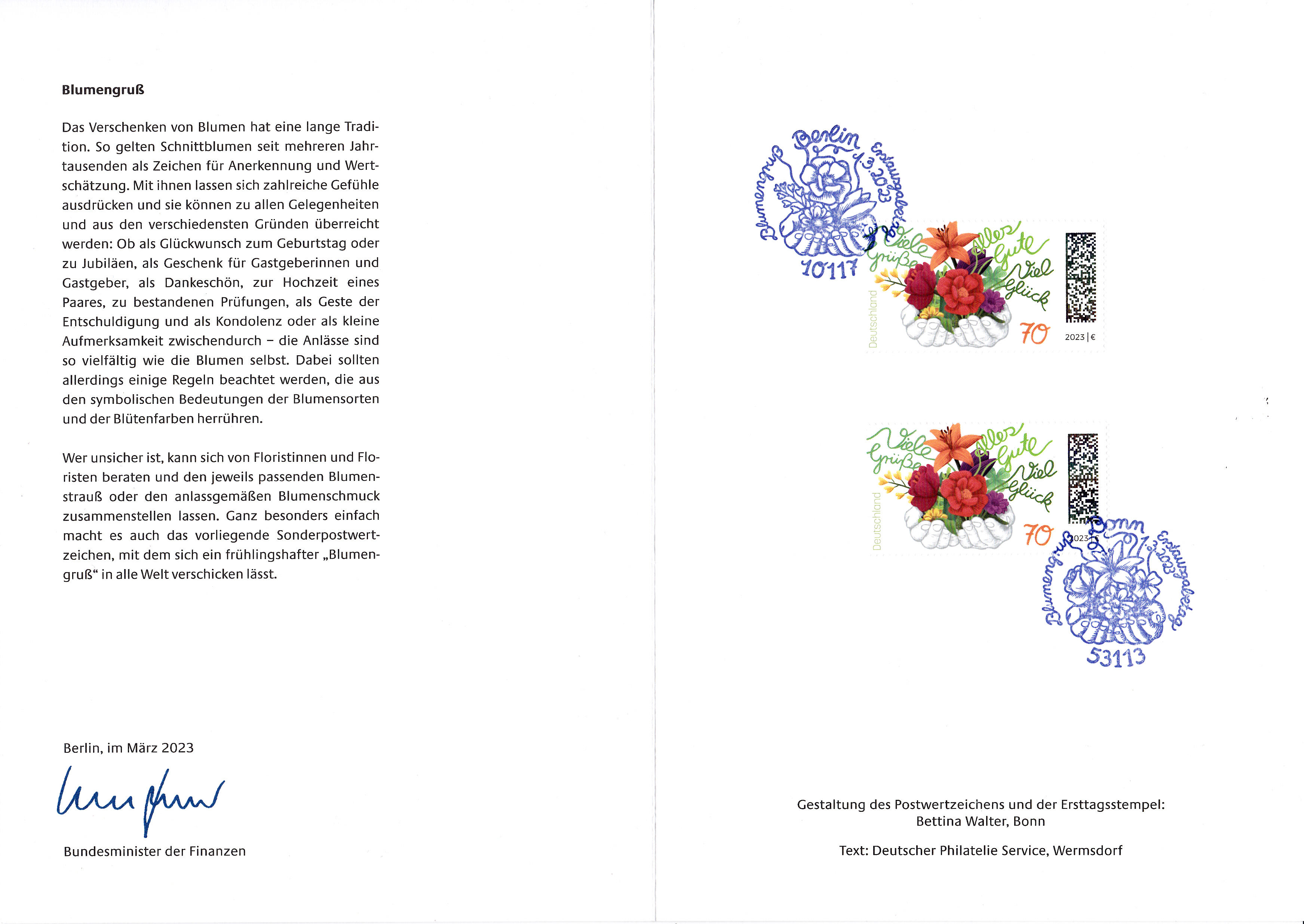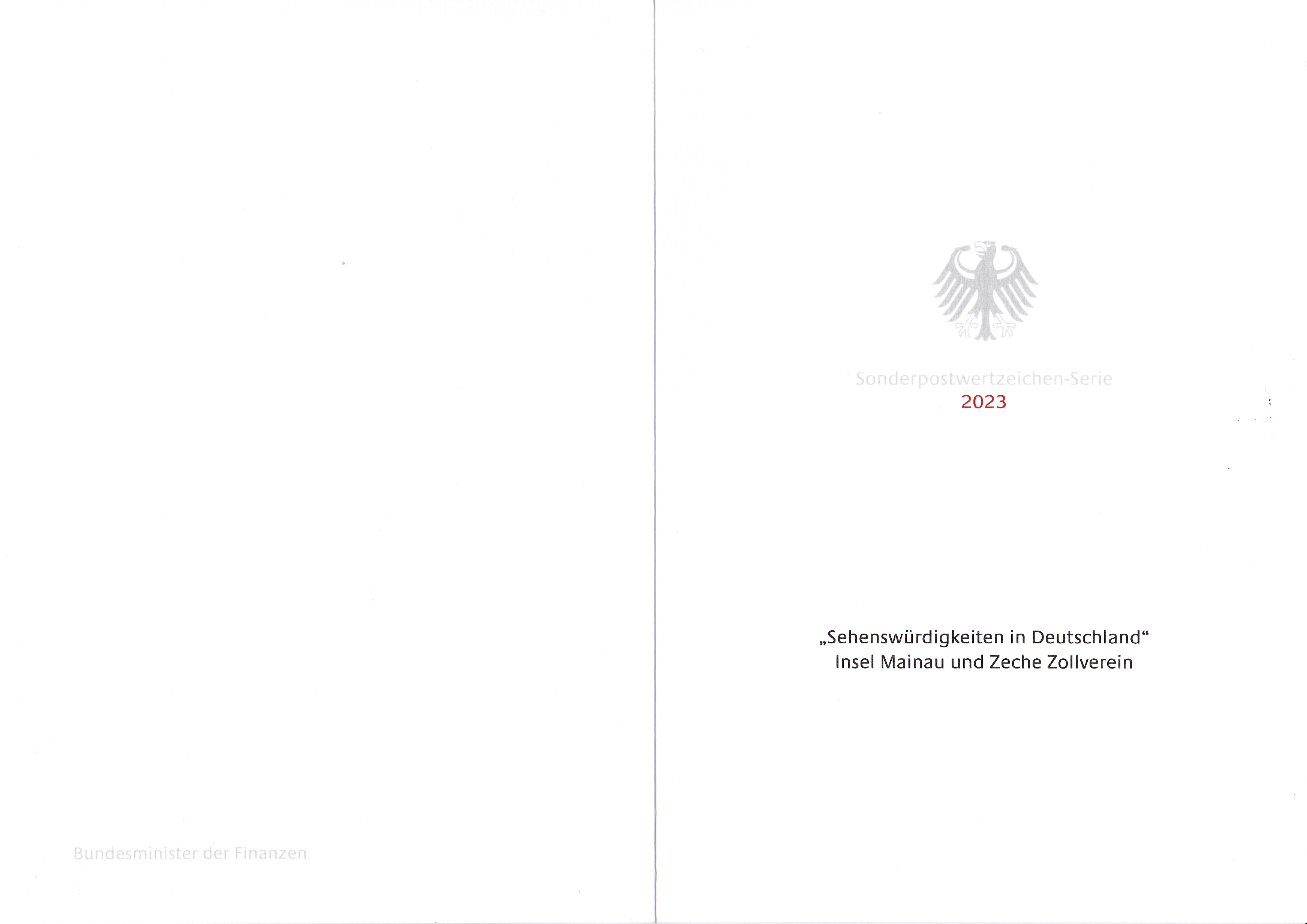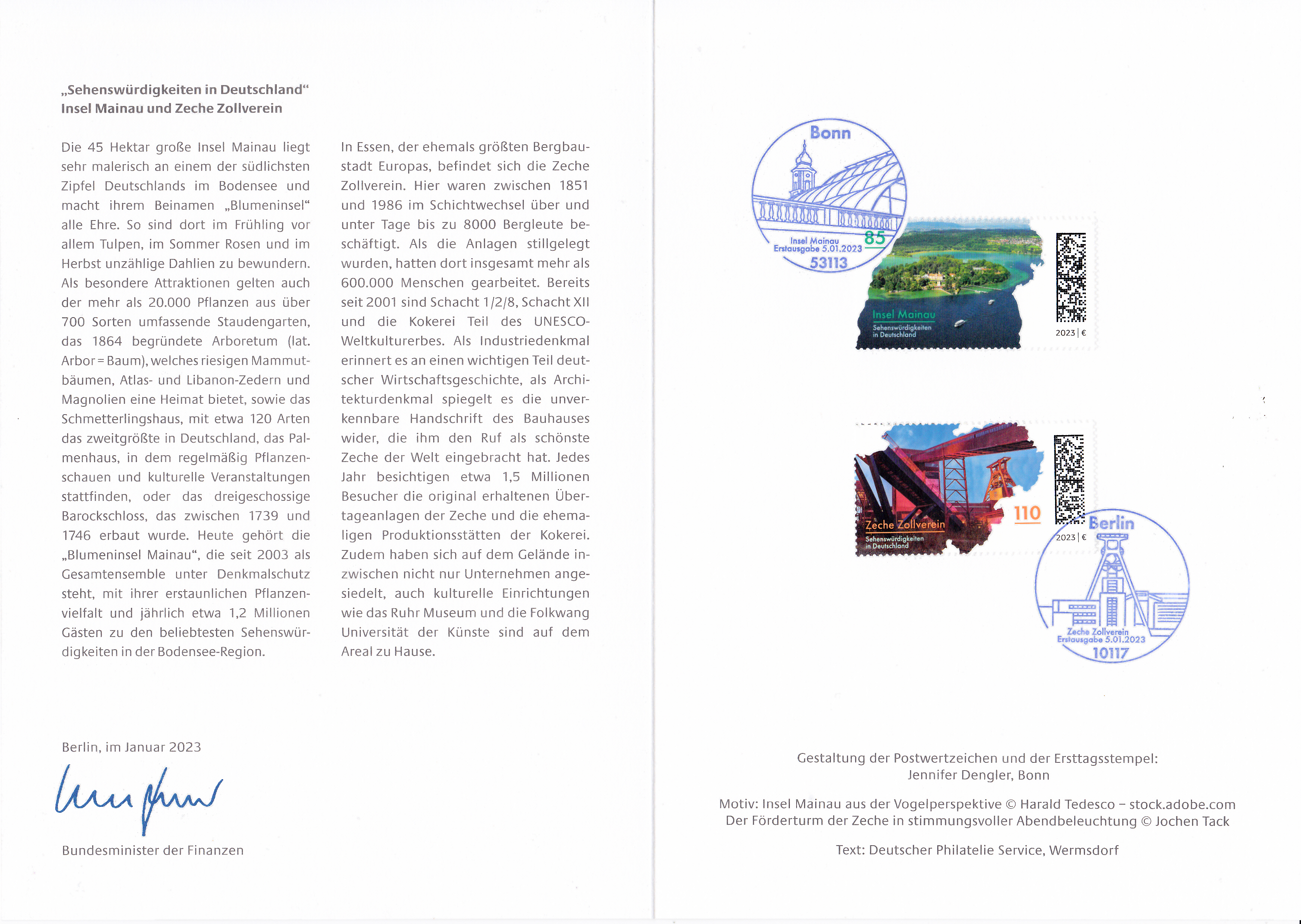 Ministerkarte des Bundesministers für Finanzen mit je einer Marke der Serie "Sehenswürdigkeiten in Deutschland" (MiNr 3738 und 3739) mit den Motiven "Blumeninsel Mainau im Bodensee" und "Förderturm der Zeche Zollverein" und den beiden Ersttagsonderstempel Bonn und Berlin.