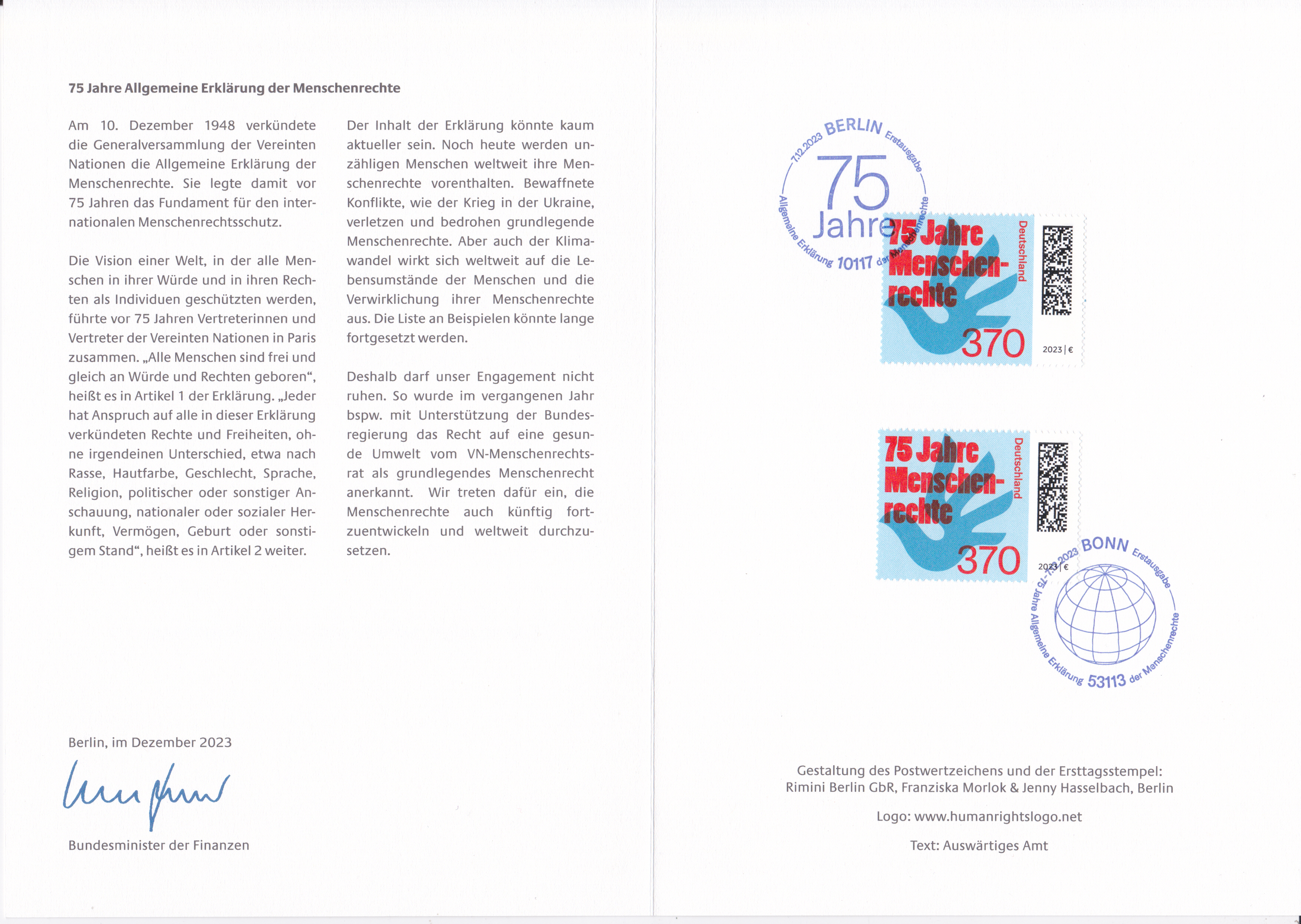 Ministerkarte des Bundesministers für Finanzen mit zwei Marken (MiNr 3805) "Allgemeine Erklärung der Menschenrechte vor 75 Jahren" und den beiden Ersttagsonderstempel Bonn und Berlin.