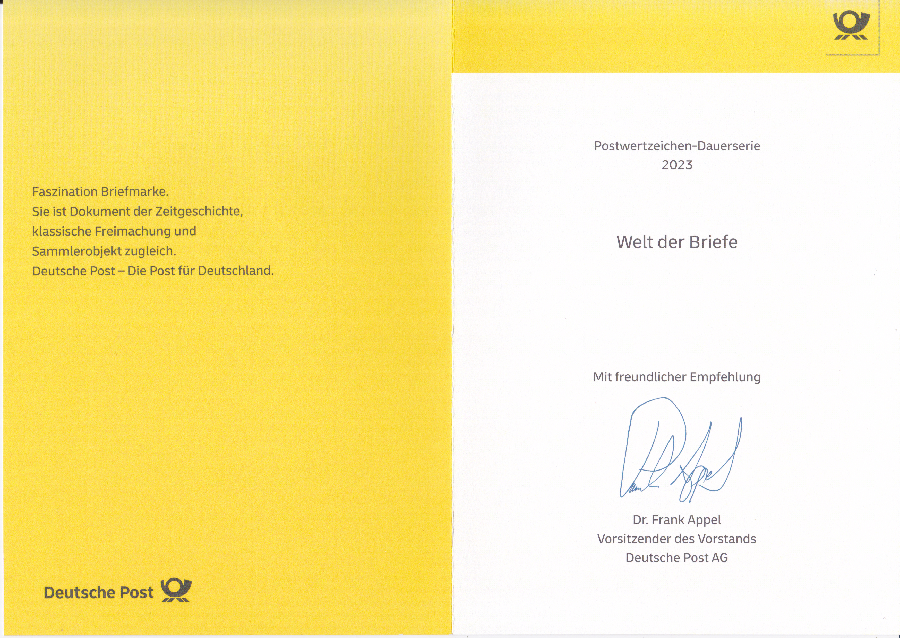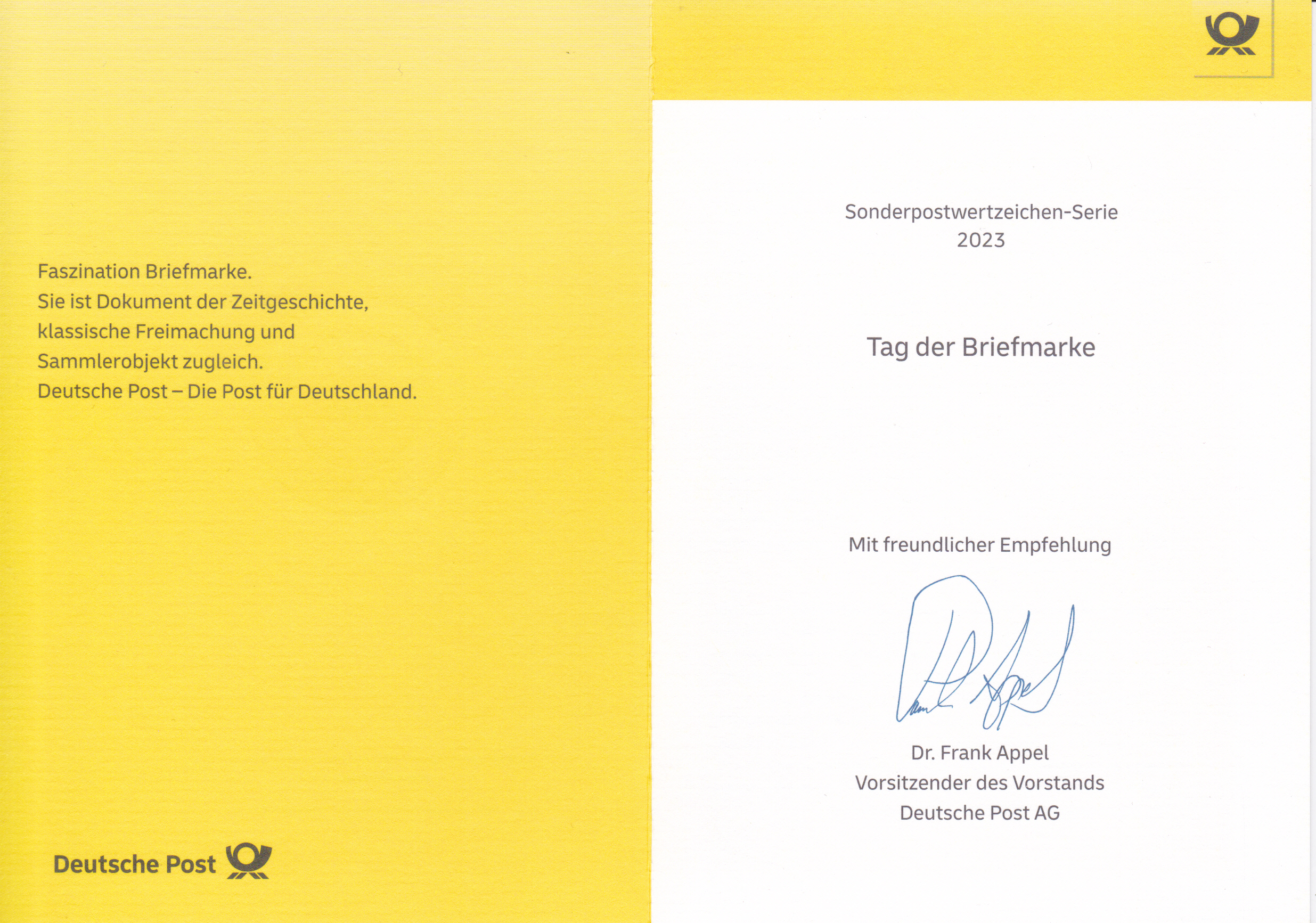 Klappkarte des Vorstandsvorsitzenden der Deutschen Post AG mit einer Marke (MiNr 3752) zum Tag der Briefmarke 2023 mit dem Stralsund-Brief und dem Ersttagsonderstempel Bonn.
