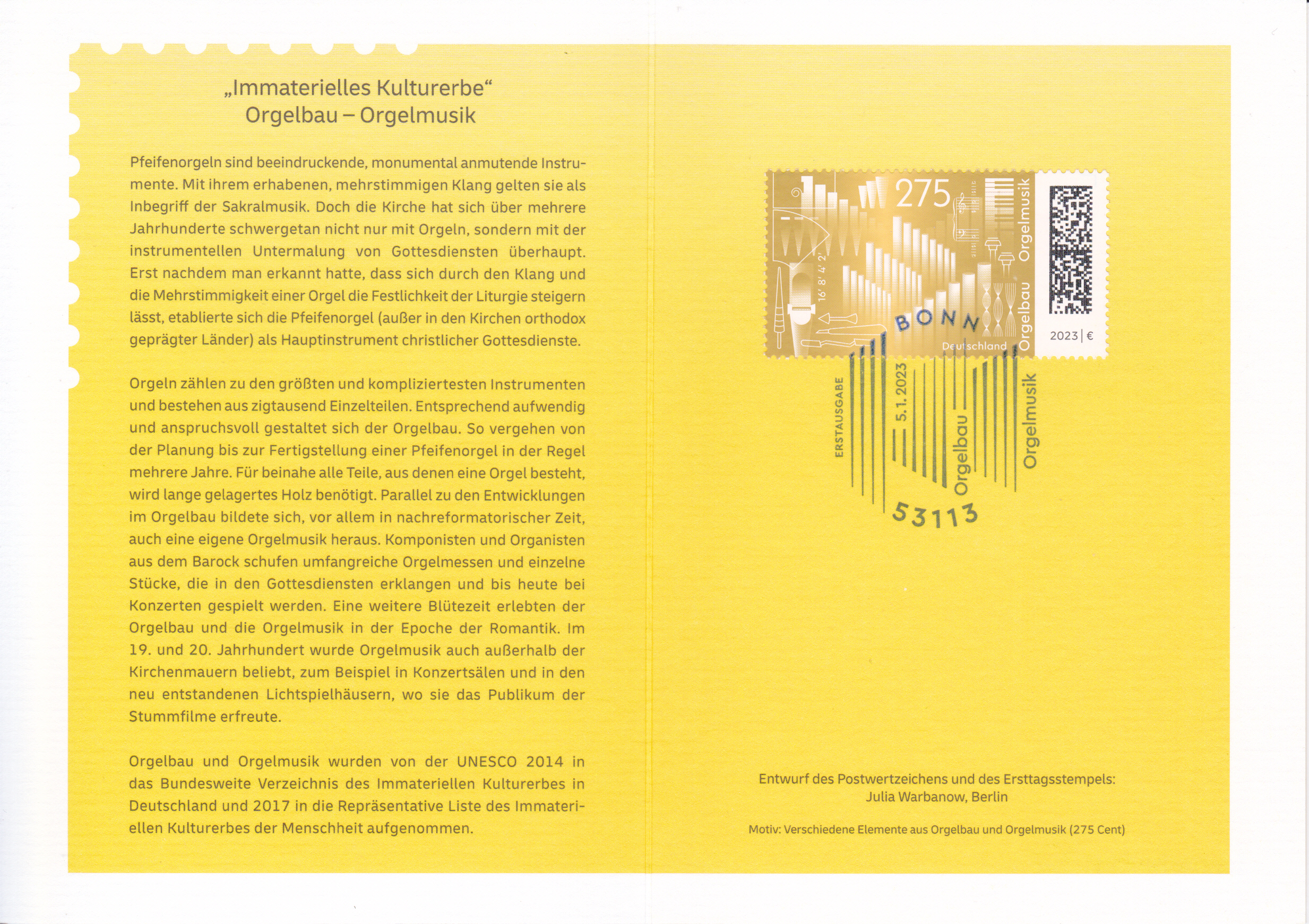 Klappkarte des Vorstandsvorsitzenden der Deutschen Post AG mit einer Marke (MiNr 3737) "Immaterielles Kulturerbe, Orgelbau und Orgelmusik in Deutschland" und dem Ersttagsonderstempel Bonn.