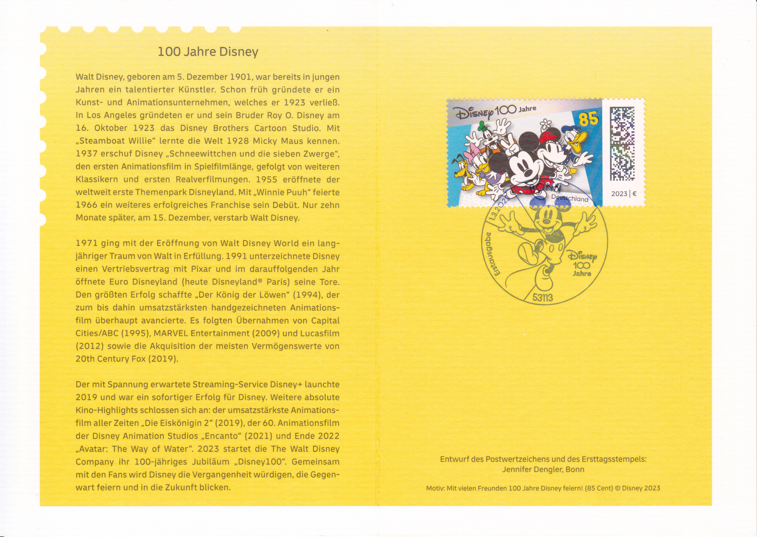 Klappkarte des Vorstandsvorsitzenden der Deutschen Post AG mit einer Marke (MiNr 3754) zum Jubiläum "100 Jahre Walt Disney Studios" und dem Ersttagsonderstempel Bonn.