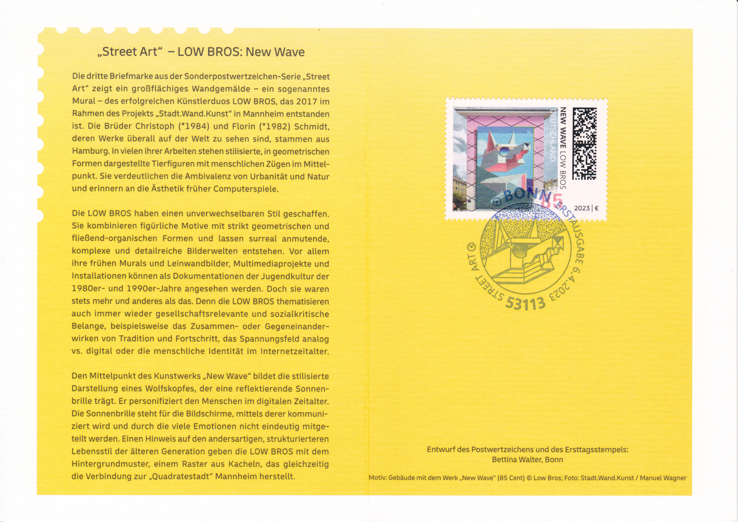 Klappkarte des Vorstandsvorsitzenden der Deutschen Post AG mit einer Marke "Wandmalerei 'New Wave'!" von Christoph Schmidt (geb.1984) und Florin Schmidt (geb.1982) alias "!Low Bros", deutsche Graffiti-Künstler aus der Serie "Street Art"(MiNr 3758) und dem Ersttagsonderstempel Bonn.