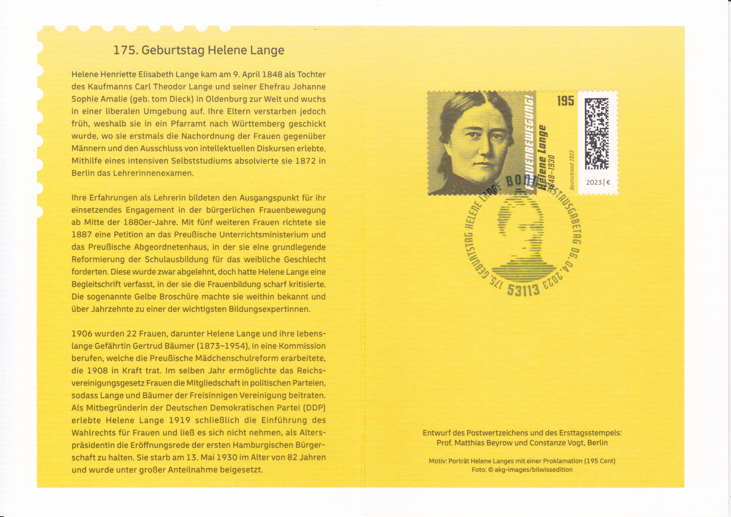 Klappkarte des Vorstandsvorsitzenden der Deutschen Post AG mit einer Marke (MiNr 3761) zum 175. Geburtstag von Helene Lange und dem Ersttagsonderstempel Bonn.