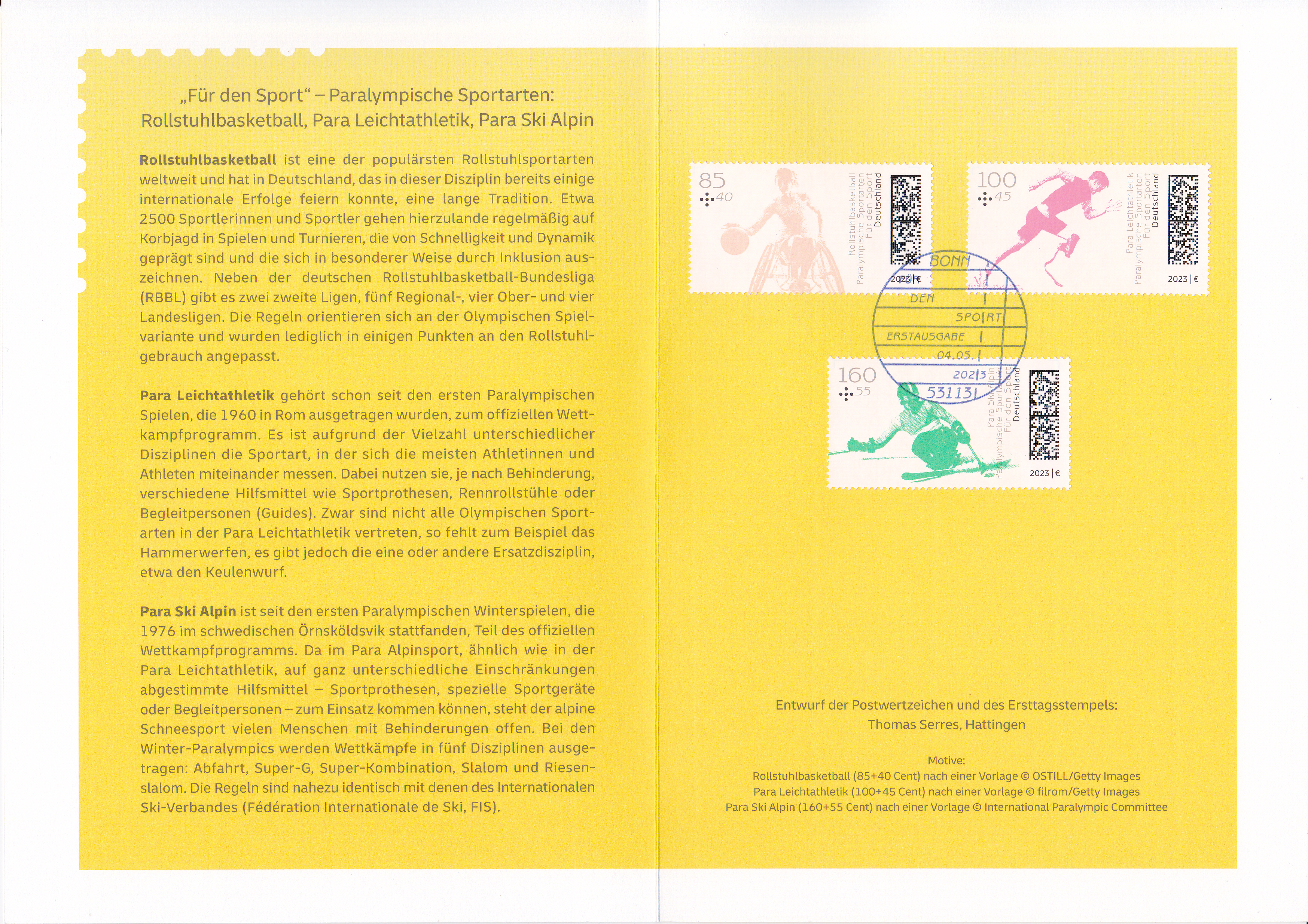 Klappkarte des Vorstandsvorsitzenden der Deutschen Post AG mit je einer Marke der Sporthilfemarken (MiNr 3762-3764) mit Motiven zum Thema "Paralympische Sportarten" und dem Ersttagsonderstempel Bonn.