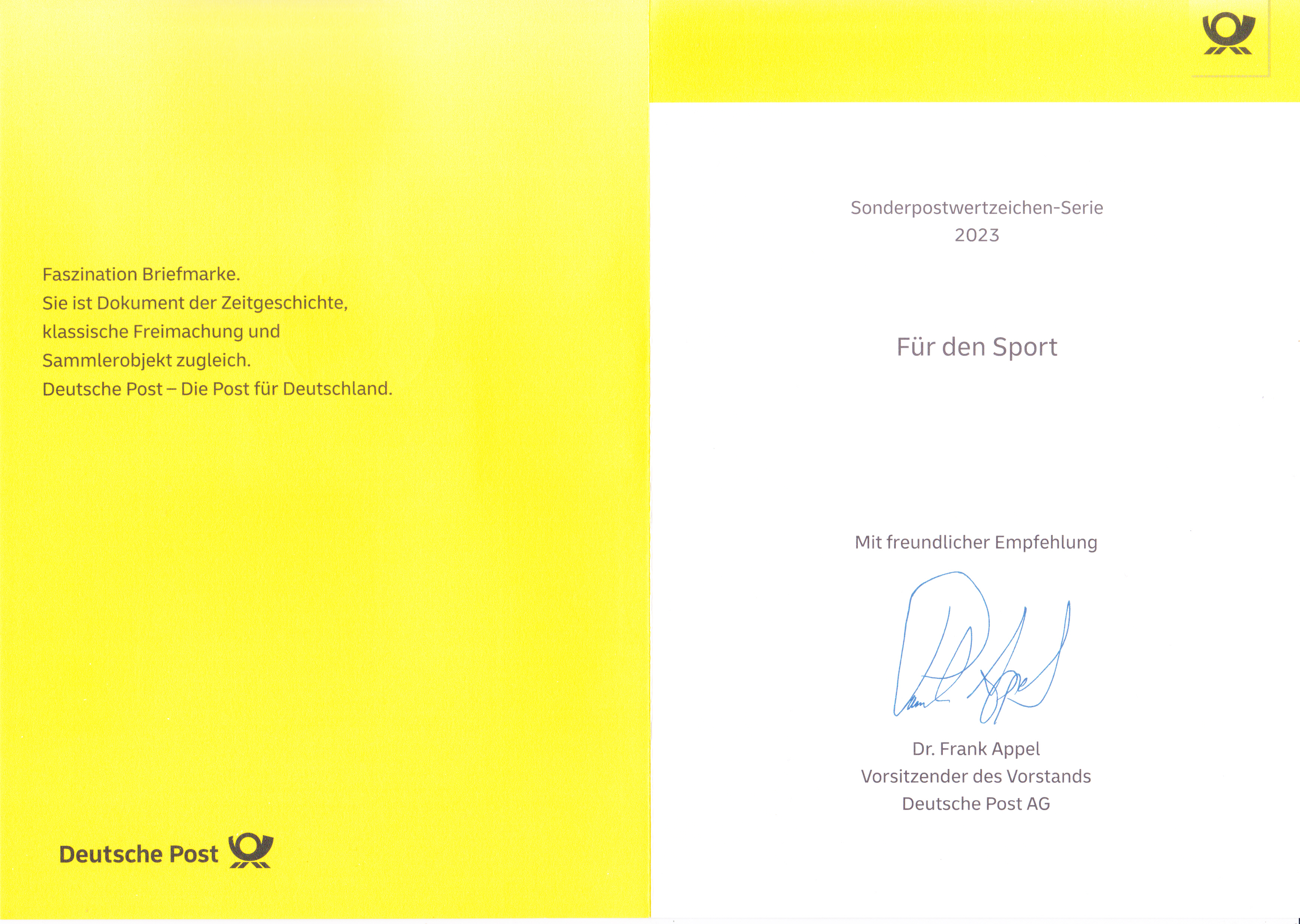 Klappkarte des Vorstandsvorsitzenden der Deutschen Post AG mit einer Marke (MiNr 3766) zur Internationale Briefmarkenausstellung IBRA 2023 und dem Ersttagsonderstempel Bonn.