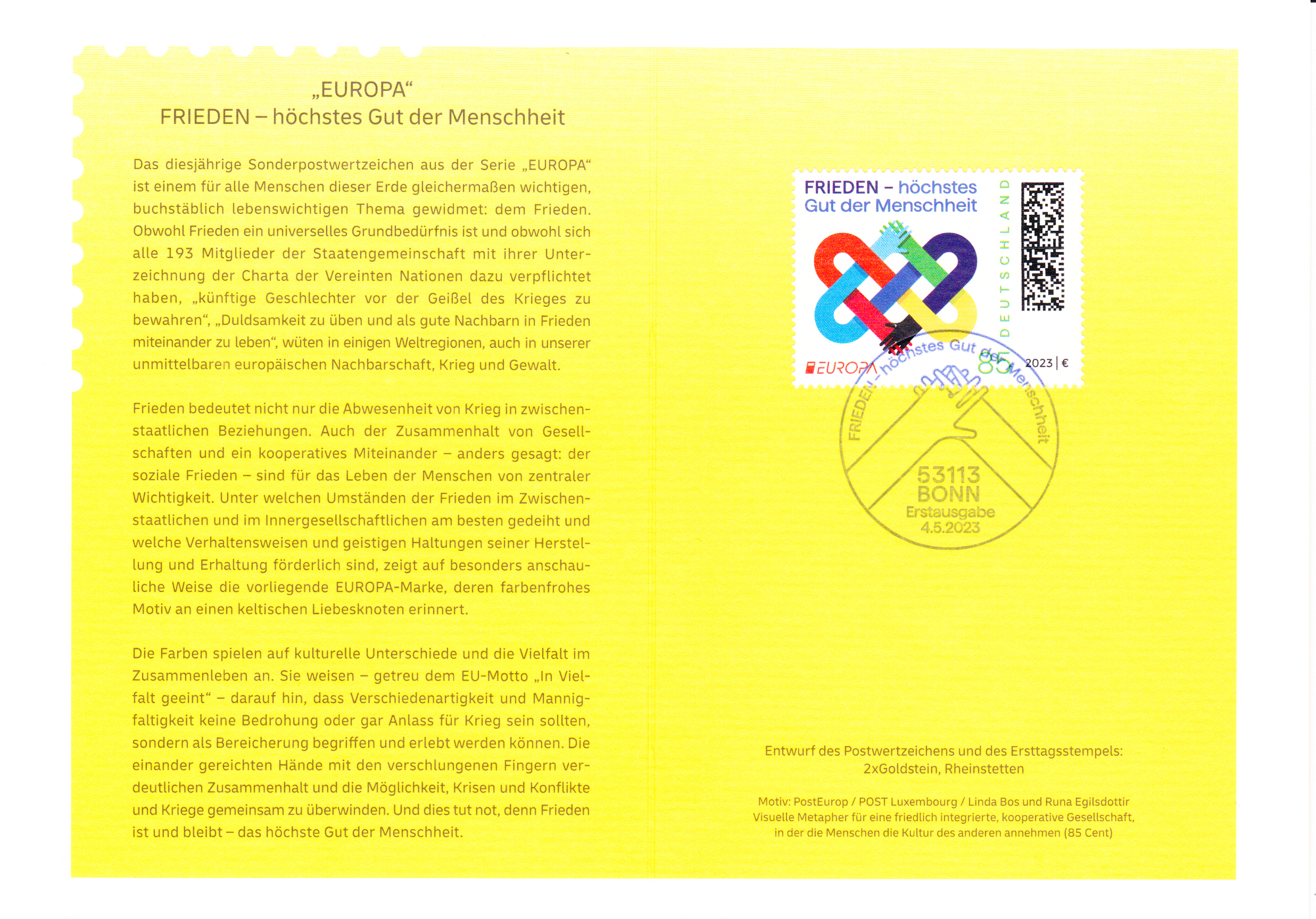 Klappkarte des Vorstandsvorsitzenden der Deutschen Post AG mit einer Europamarke 2022 (MiNr 3765) mit dem Gemeinschaftsmotiv "Verschlungene Bänder mit ineinanderfassenden Händen" zum Thema "Frieden" und dem Ersttagsonderstempel Bonn.