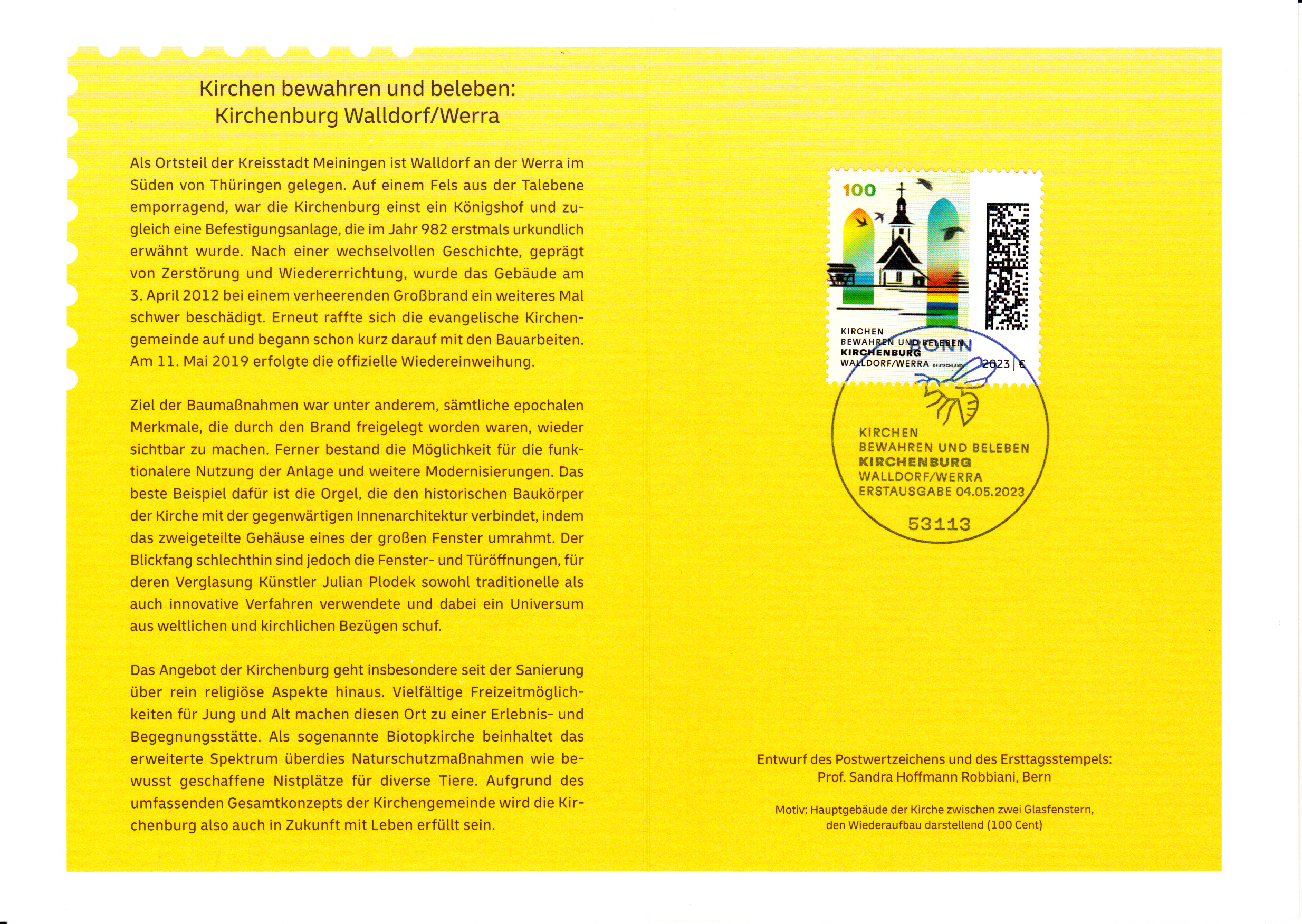 Klappkarte des Vorstandsvorsitzenden der Deutschen Post AG mit einer Marke (MiNr 3767) zum Thema "Kirchen bewahren und beleben, Kirchenburg Walldorf an der Werra" und dem Ersttagsonderstempel Bonn.