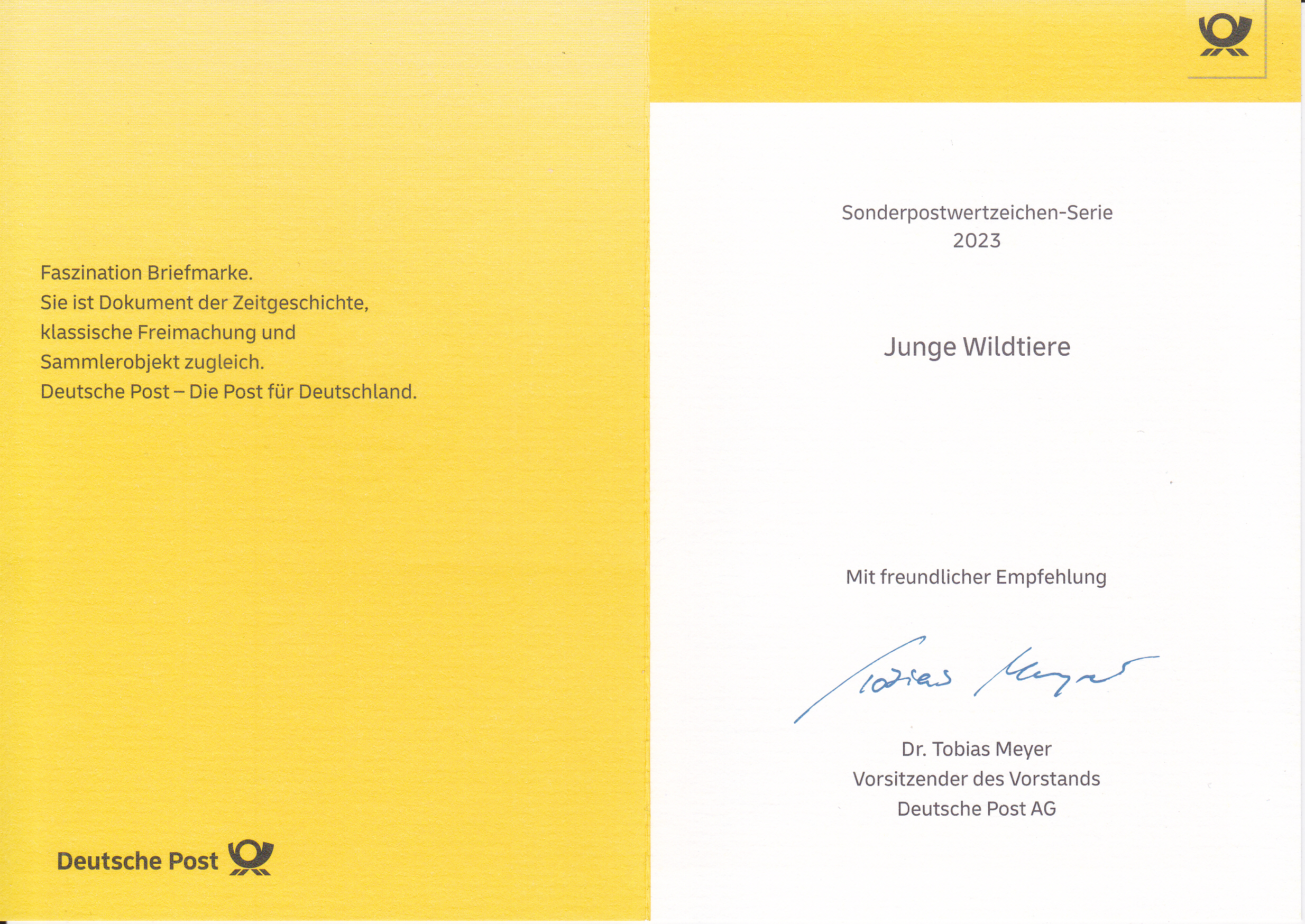 Klappkarte des Vorstandsvorsitzenden der Deutschen Post AG mit einer Marke (MiNr 3782) mit dem Motiv "Zwei Europäische Ziesel (Spermophilus citellus)" aus der Serie "Tierbabys" und dem Ersttagsonderstempel Bonn.