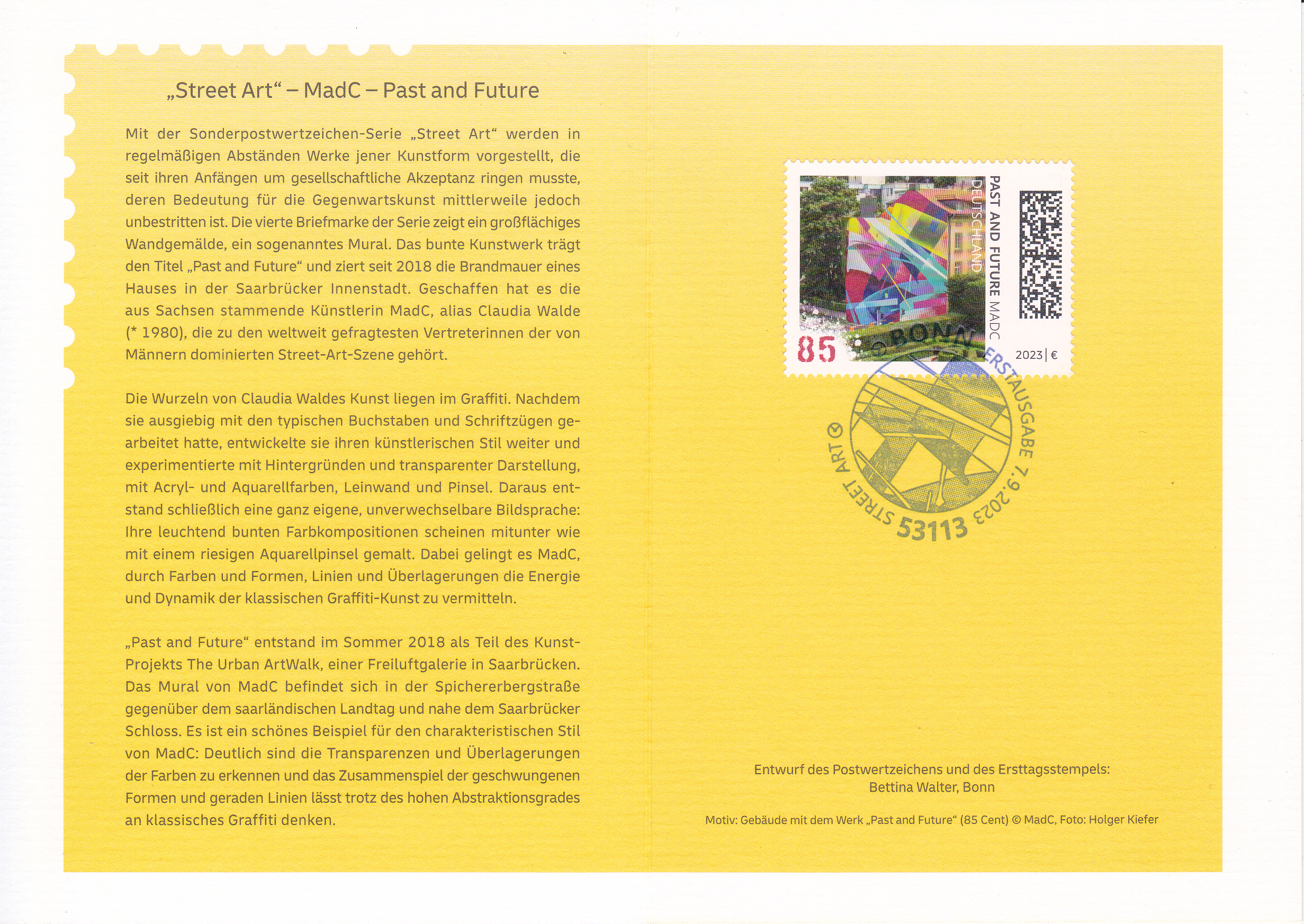 Klappkarte des Vorstandsvorsitzenden der Deutschen Post AG mit einer Marke (MiNr 3783) mit der Wandmalerei "Past and Future" von Claudia Walde (geb.1980; alias "MadC" aus der Serie "Street Art" und dem Ersttagsonderstempel Bonn.