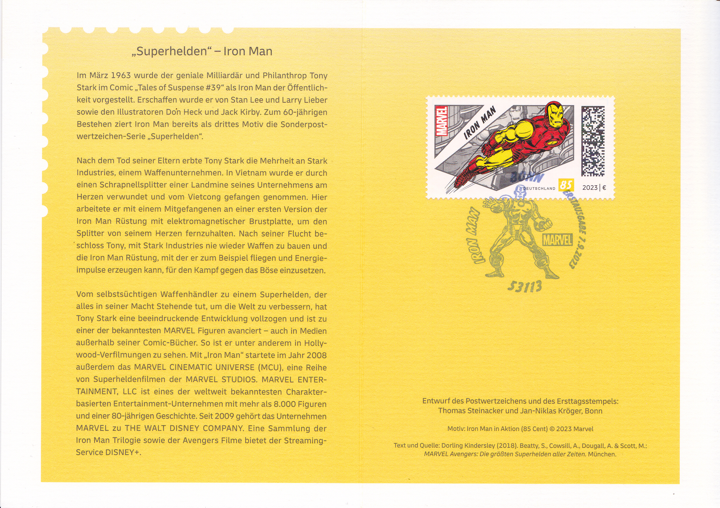 Klappkarte des Vorstandsvorsitzenden der Deutschen Post AG mit einer Marke (MiNr 3784) mit dem Motiv "Iron Man (Anthony "Tony" Edward Stark) im Flug" aus der Serie "Superhelden" und dem Ersttagsonderstempel Bonn.
