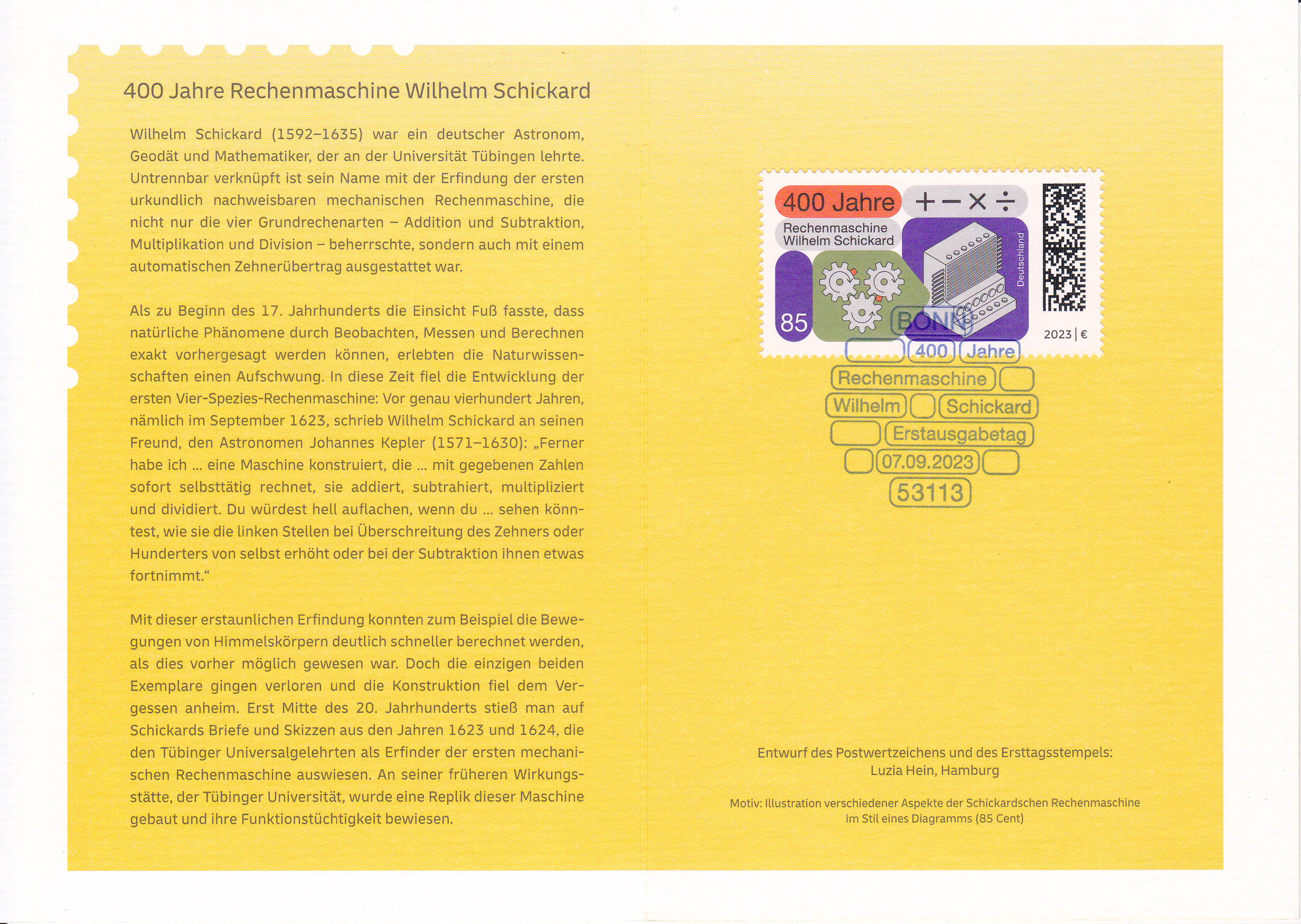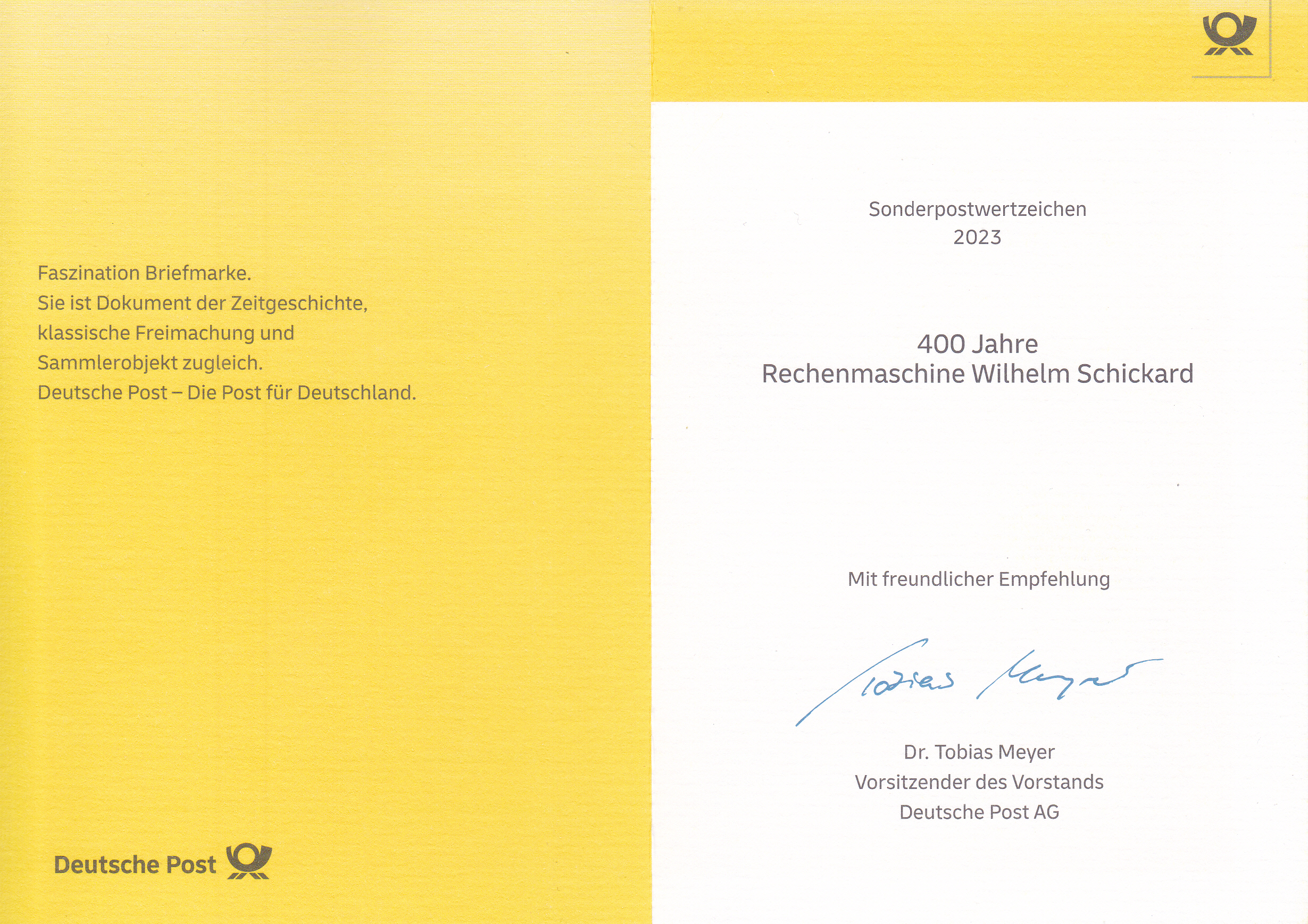 Klappkarte des Vorstandsvorsitzenden der Deutschen Post AG mit einer Marke (MiNr 3786) "Erfindung der ersten mechanischen Rechenmaschine durch Wilhelm Schickard vor 400 Jahren" und dem Ersttagsonderstempel Bonn.