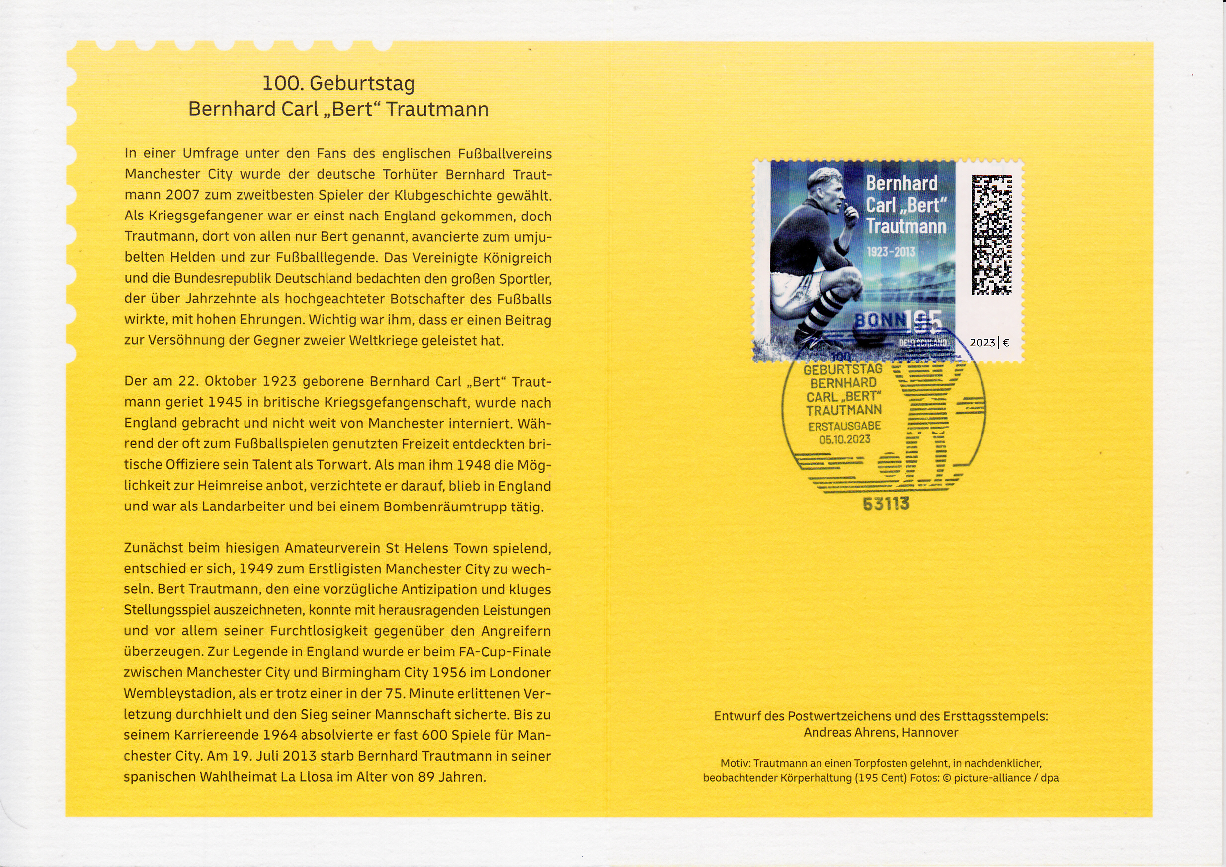 Klappkarte des Vorstandsvorsitzenden der Deutschen Post AG mit einer Marke (MiNr 3787) zum 100. Geburtstag von Bernhard Carl Trautmann (1923-2013; deutscher Fußballspieler) und dem Ersttagsonderstempel Bonn.