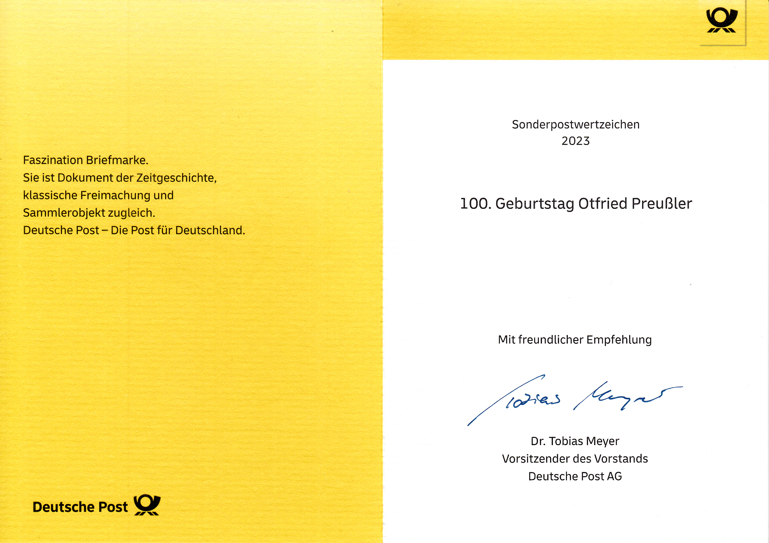 Klappkarte des Vorstandsvorsitzenden der Deutschen Post AG mit einer Marke (MiNr 3788) zum 100. Geburtstag von Otfried Preußler (1923-2013; böhmischer Kinder- und Jugendbuchautor) und dem Ersttagsonderstempel Bonn.