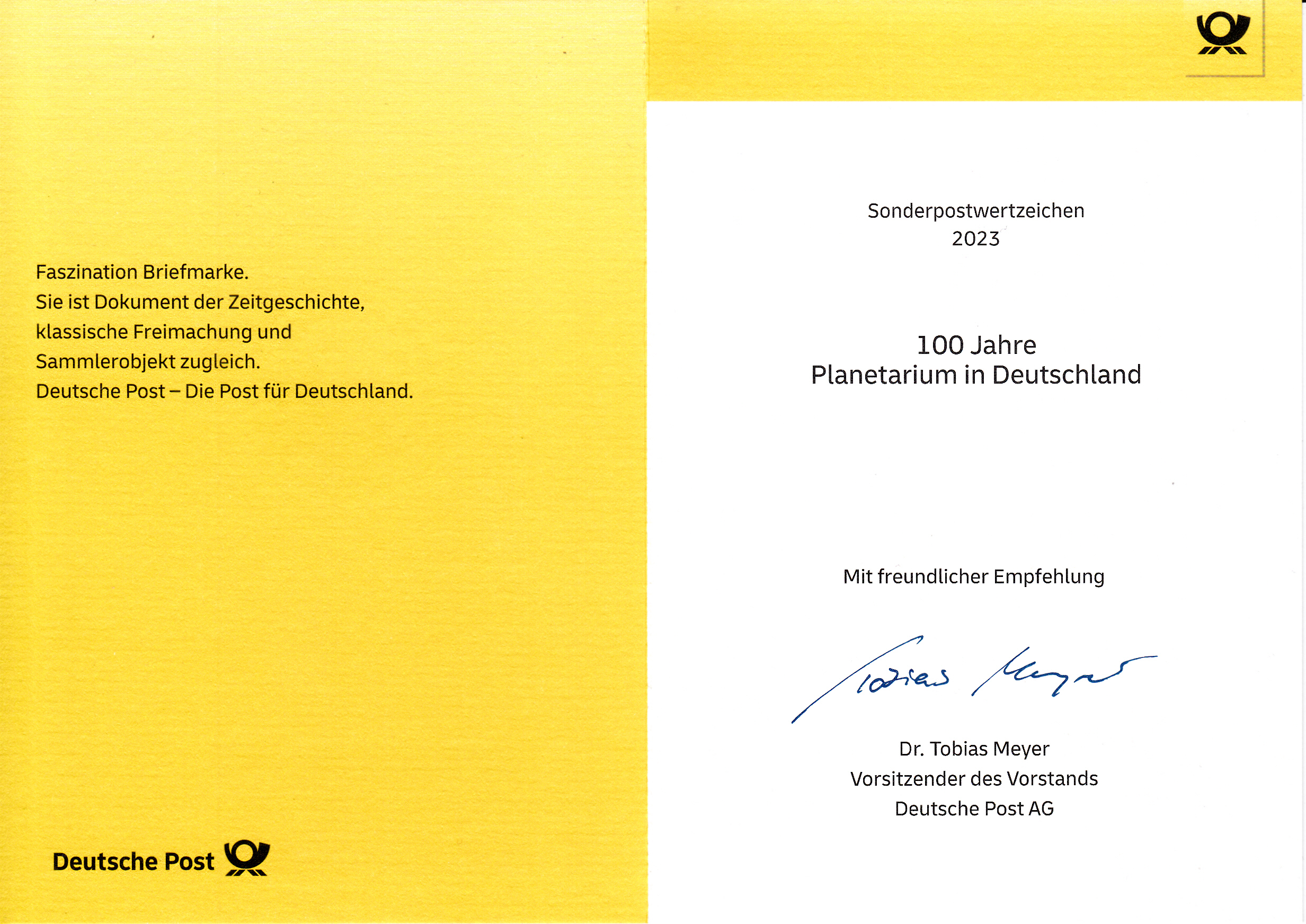 Klappkarte des Vorstandsvorsitzenden der Deutschen Post AG mit einer Marke (MiNr 3789) zum Jubiläum "100 Jahre planetarische Vorführungen in Deutschland" und dem Ersttagsonderstempel Bonn.