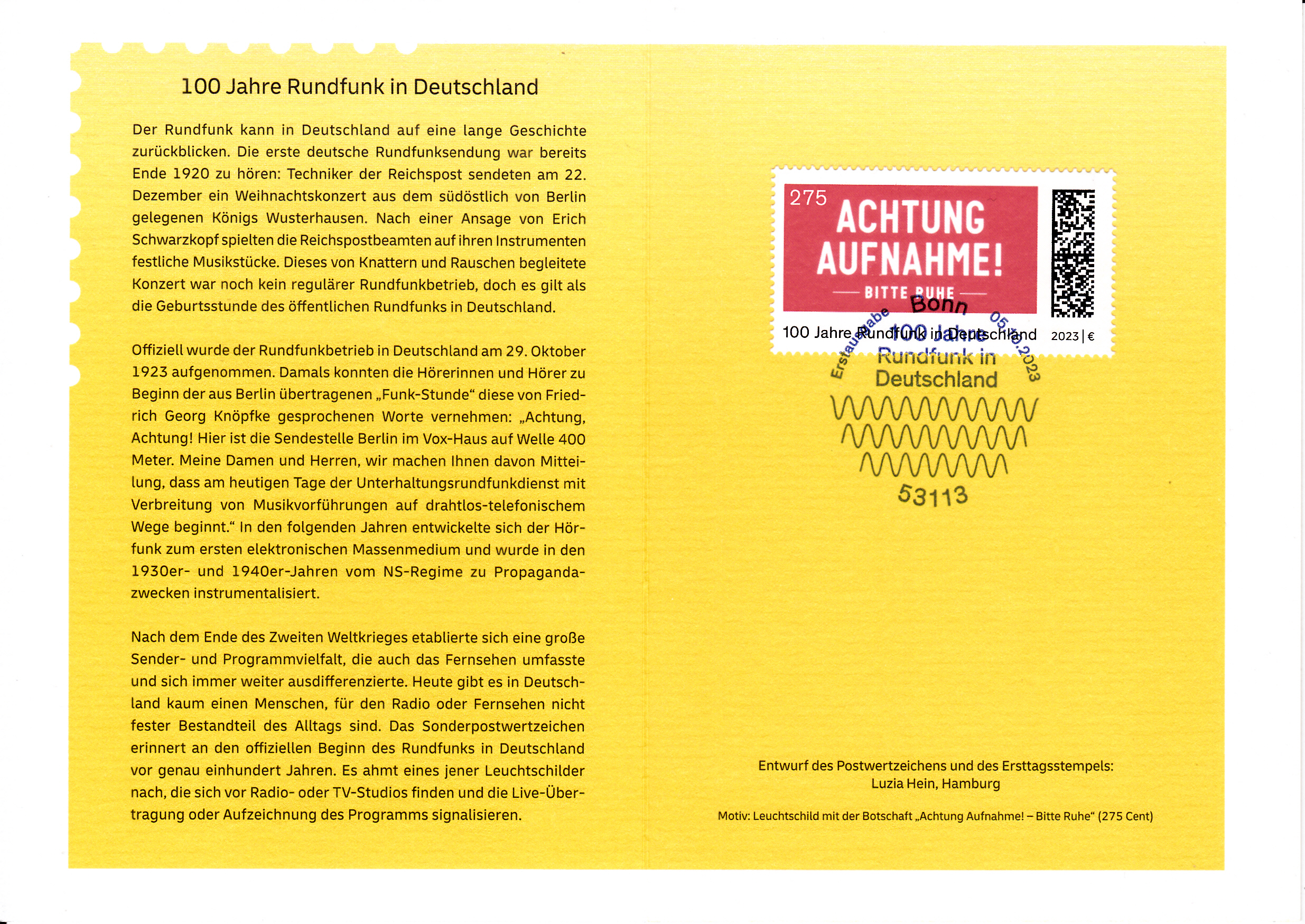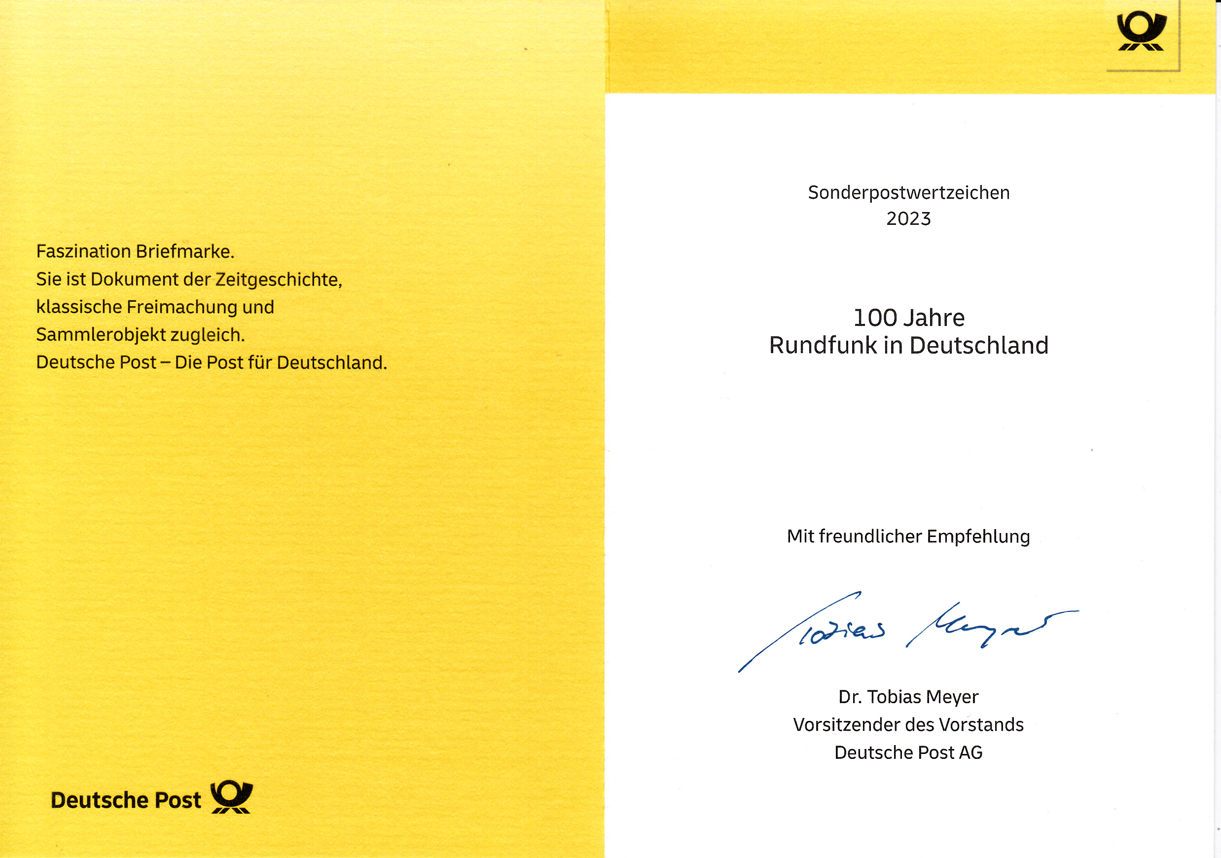 Klappkarte des Vorstandsvorsitzenden der Deutschen Post AG mit einer Marke (MiNr 3790) zum Jubiläum "100 Jahre Rundfunk in Deutschland" und dem Ersttagsonderstempel Bonn.