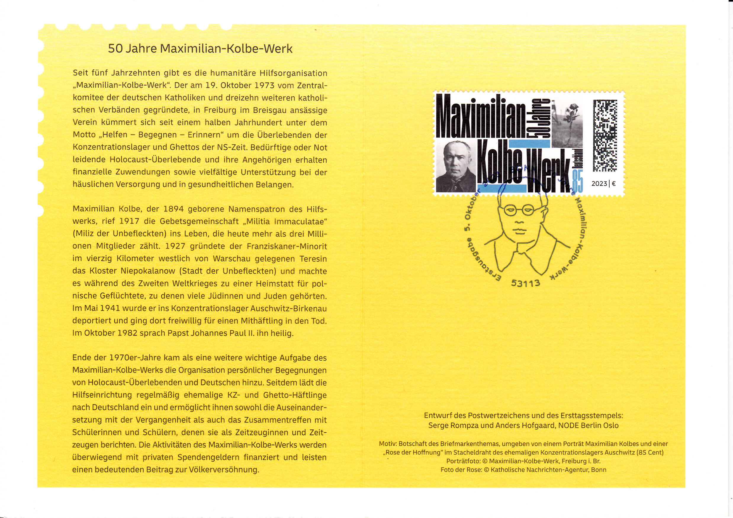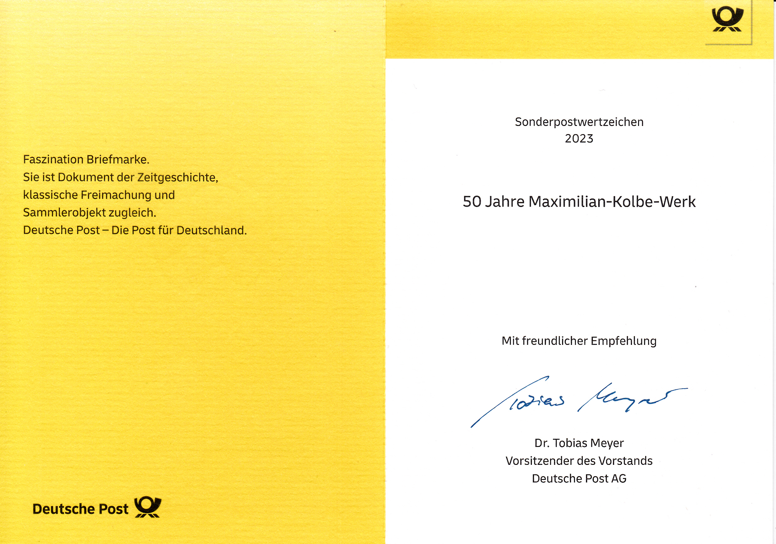 Klappkarte des Vorstandsvorsitzenden der Deutschen Post AG mit einer Marke (MiNr 3791) zum Jubiläum "50 Jahre Maximilian-Kolbe-Werk" und dem Ersttagsonderstempel Bonn.