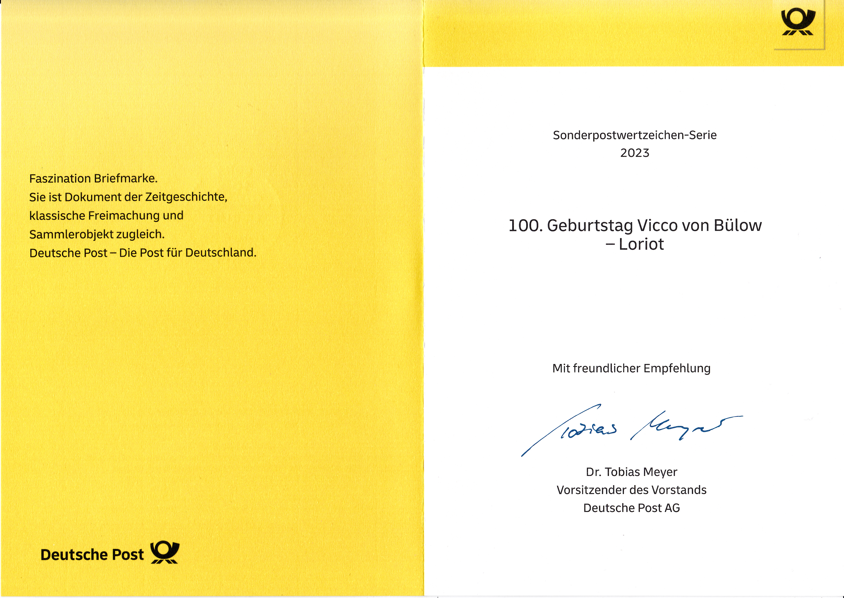 Klappkarte des Vorstandsvorsitzenden der Deutschen Post AG mit den beiden Marken (MiNr 3794 und 3795) zum 100. Geburtstag von Vicco von Bülow (1923-2013; deutscher Zeichner und Humorist) und dem Ersttagsonderstempel Bonn.