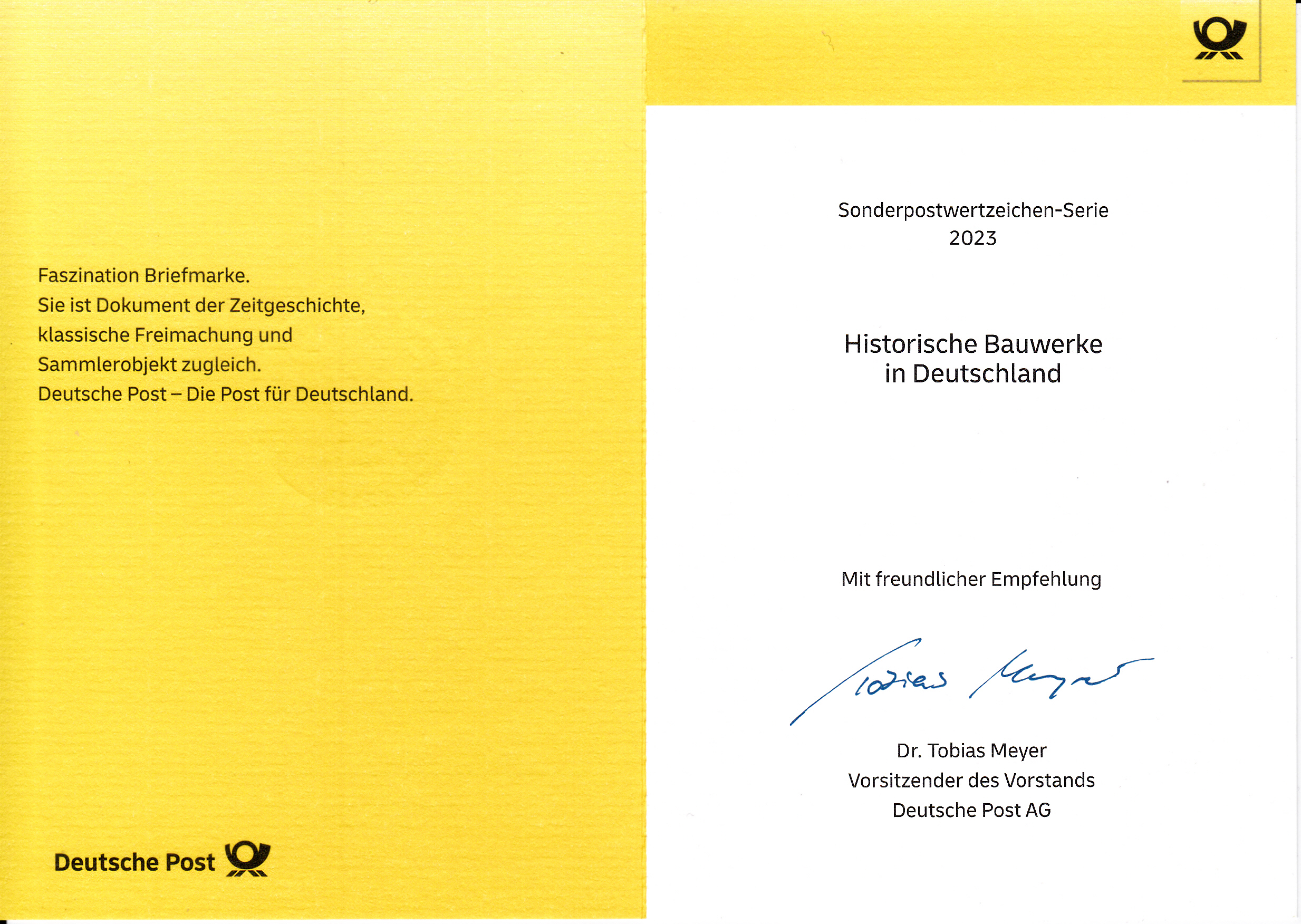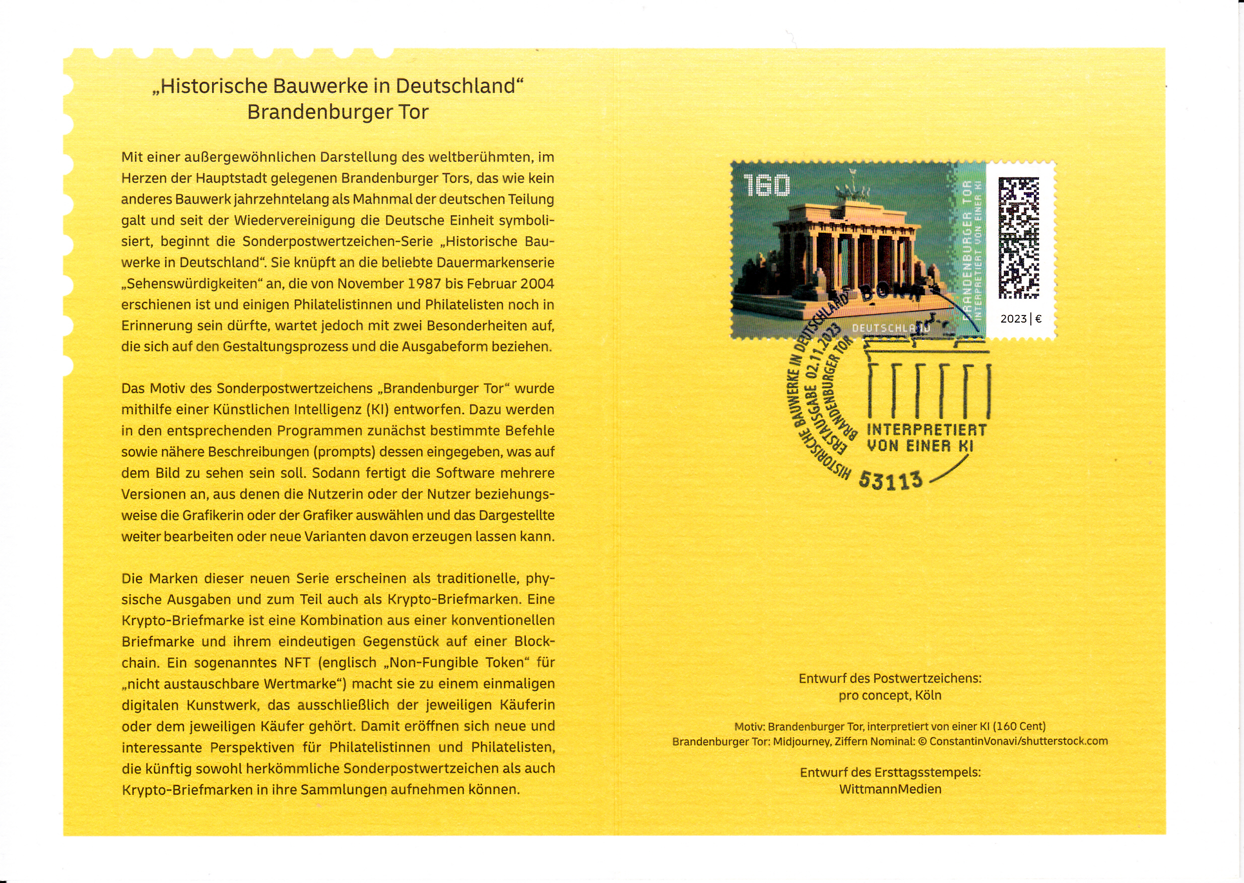 Klappkarte des Vorstandsvorsitzenden der Deutschen Post AG mit einer Marke (MiNr 3796) mit dem Motiv "Brandenburger Tor in Berlin" aus der Serie "Historische Bauwerke Deutschlands" und dem Ersttagsonderstempel Bonn.