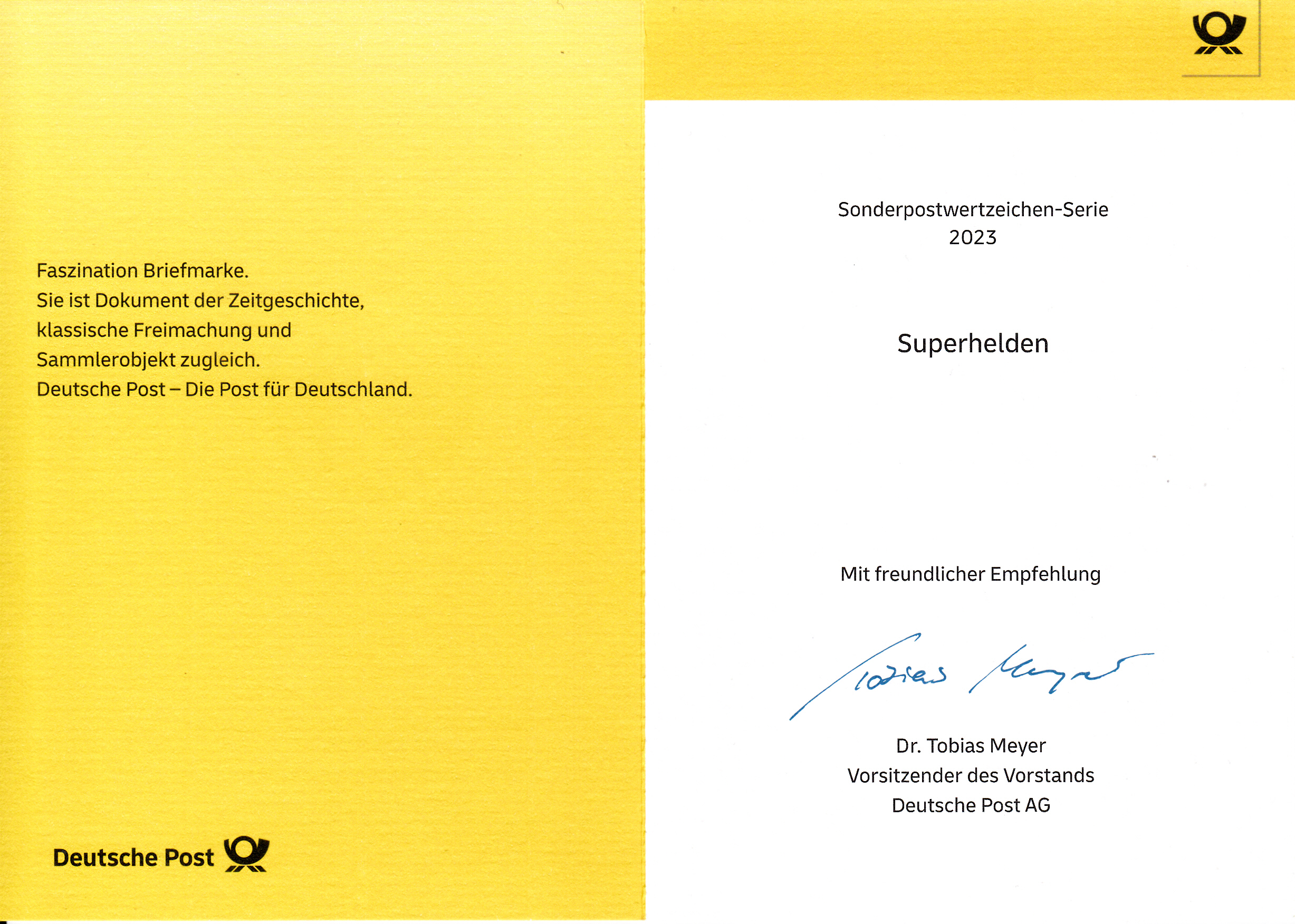 Klappkarte des Vorstandsvorsitzenden der Deutschen Post AG mit einer Marke (MiNr 3797) mit dem Motiv "Captain Marvel (Carol Danvers) kampfbereit im Flug" aus der Serie "Superhelden" und dem Ersttagsonderstempel Bonn.