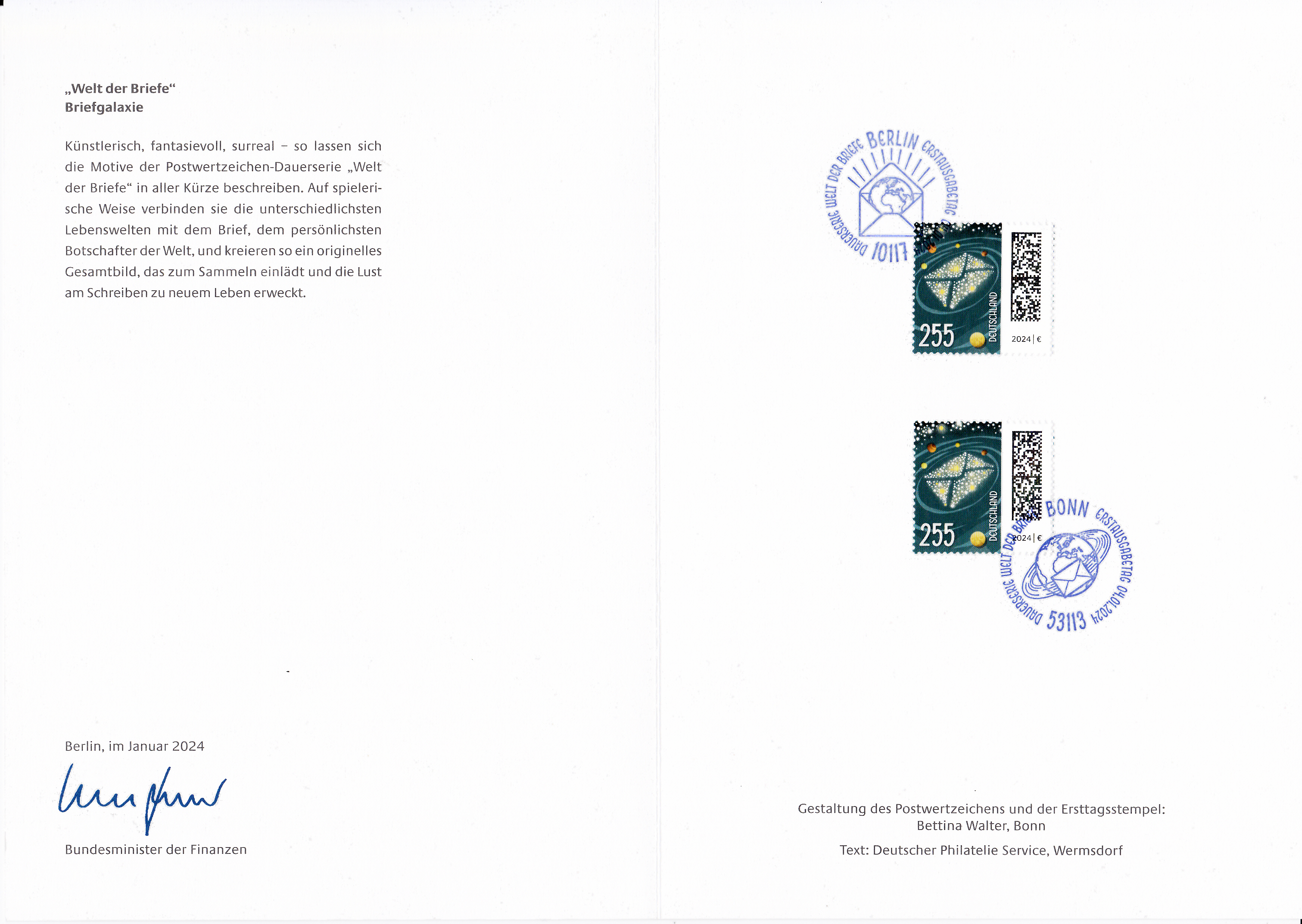 Ministerkarte des Bundesministers für Finanzen mit zwei Marken (MiNr 3806) zu 255 Cent mit dem Motiv "Briefgalaxie" aus der Dauerserie "Welt der Briefe" und den beiden Ersttagsonderstempel Bonn und Berlin.