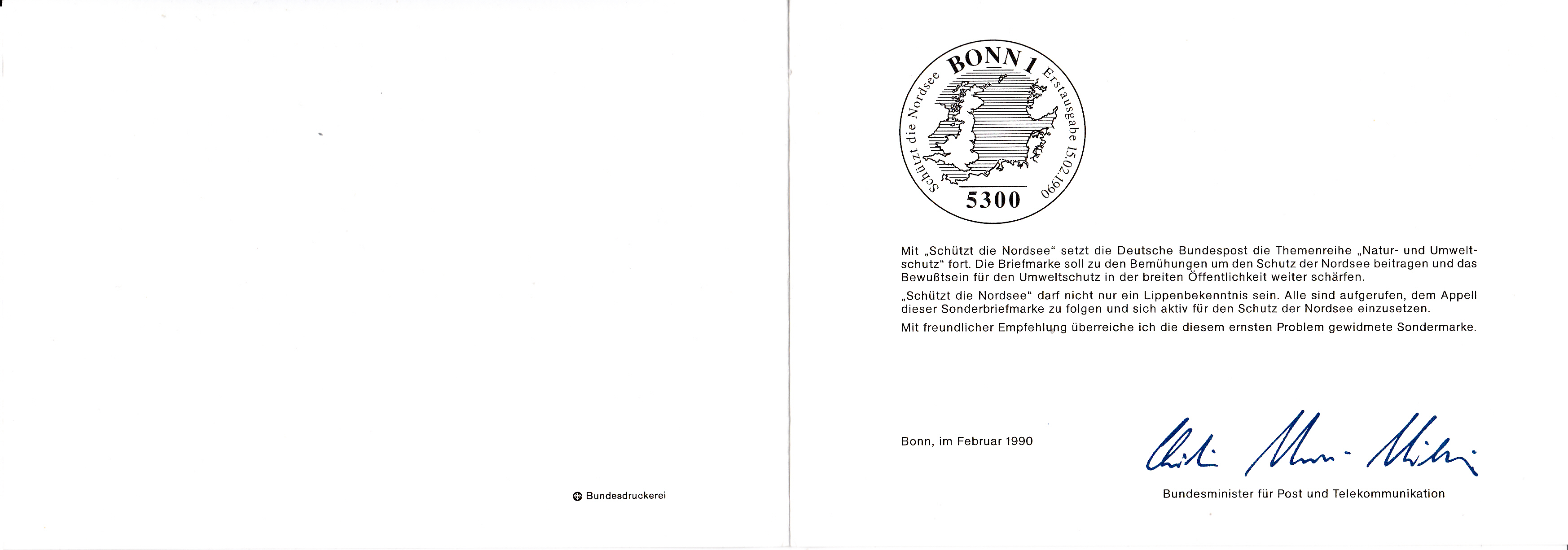 Ministerkarte des Bundesministers für Post und Telekommunikation mit einer Marke (MiNr 1454) "Internationale Nordseeschutz-Konferenz, Den Haag" und dem Ersttagsonderstempel Bonn.