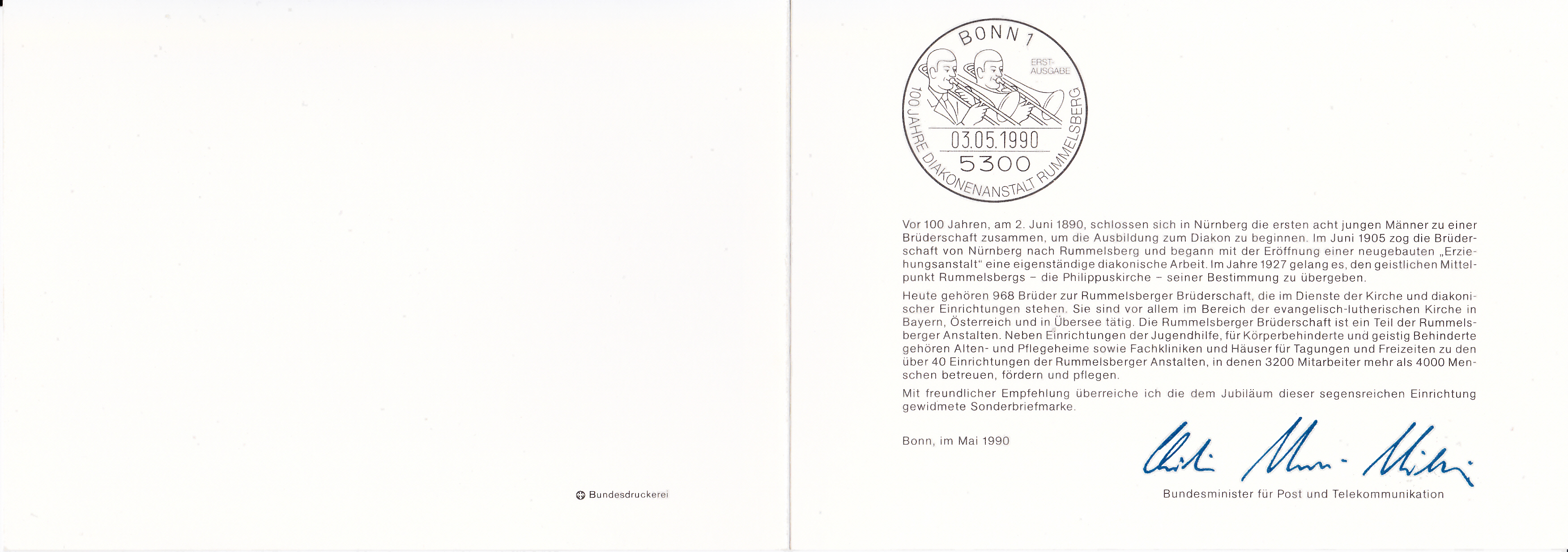 Ministerkarte des Bundesministers für Post und Telekommunikation mit einer Marke (MiNr 1467) "100 Jahre Diakonenanstalt Rummelsberg" und dem Ersttagsonderstempel Bonn.