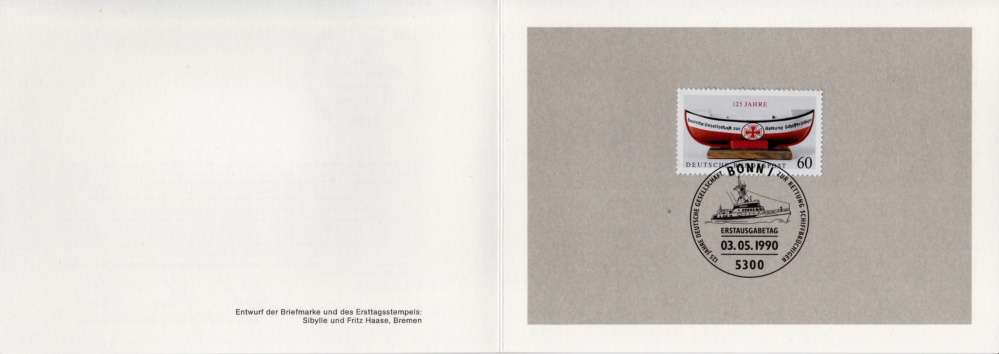 Ministerkarte des Bundesministers für Post und Telekommunikation mit einer Marke (MiNr 1465) "125 Jahre Deutsche Gesellschaft zur Rettung Schiffbrüchiger" und dem Ersttagsonderstempel Bonn.