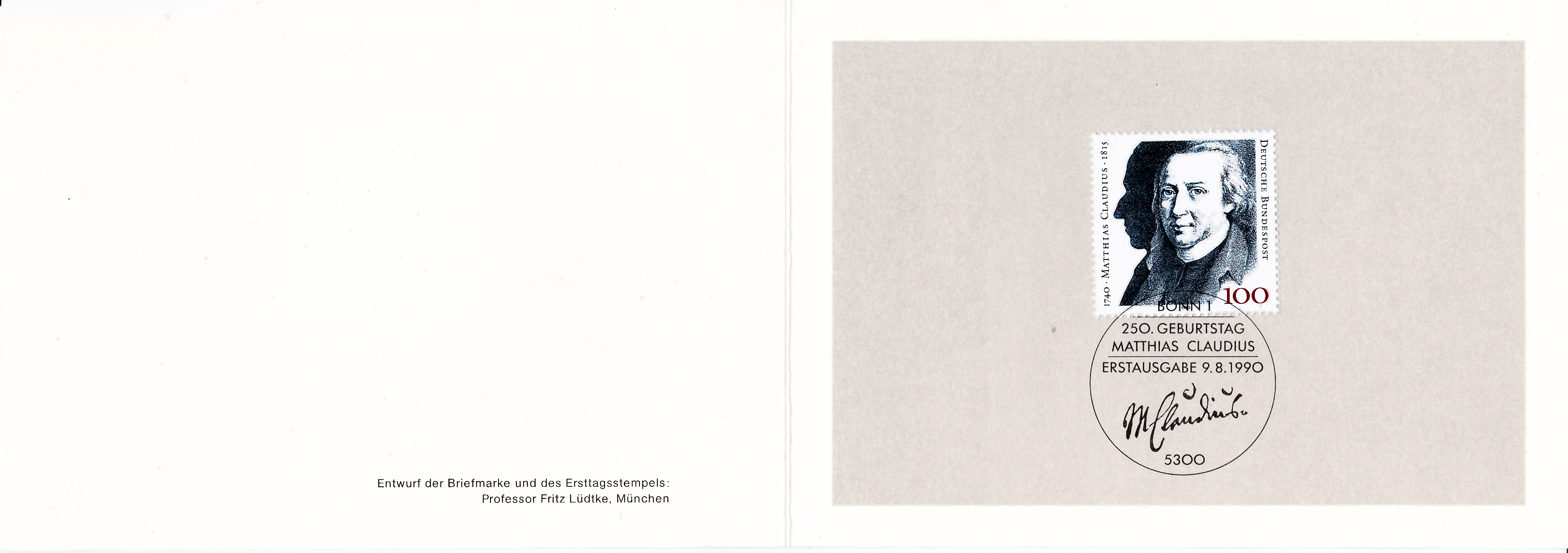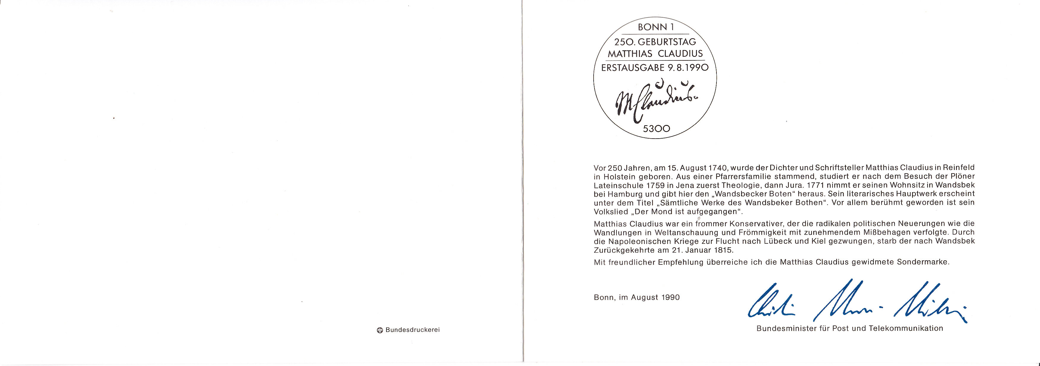 Ministerkarte des Bundesministers für Post und Telekommunikation mit einer Marke (MiNr 1473) "250. Geburtstag von Matthias Claudius" und dem Ersttagsonderstempel Bonn.
