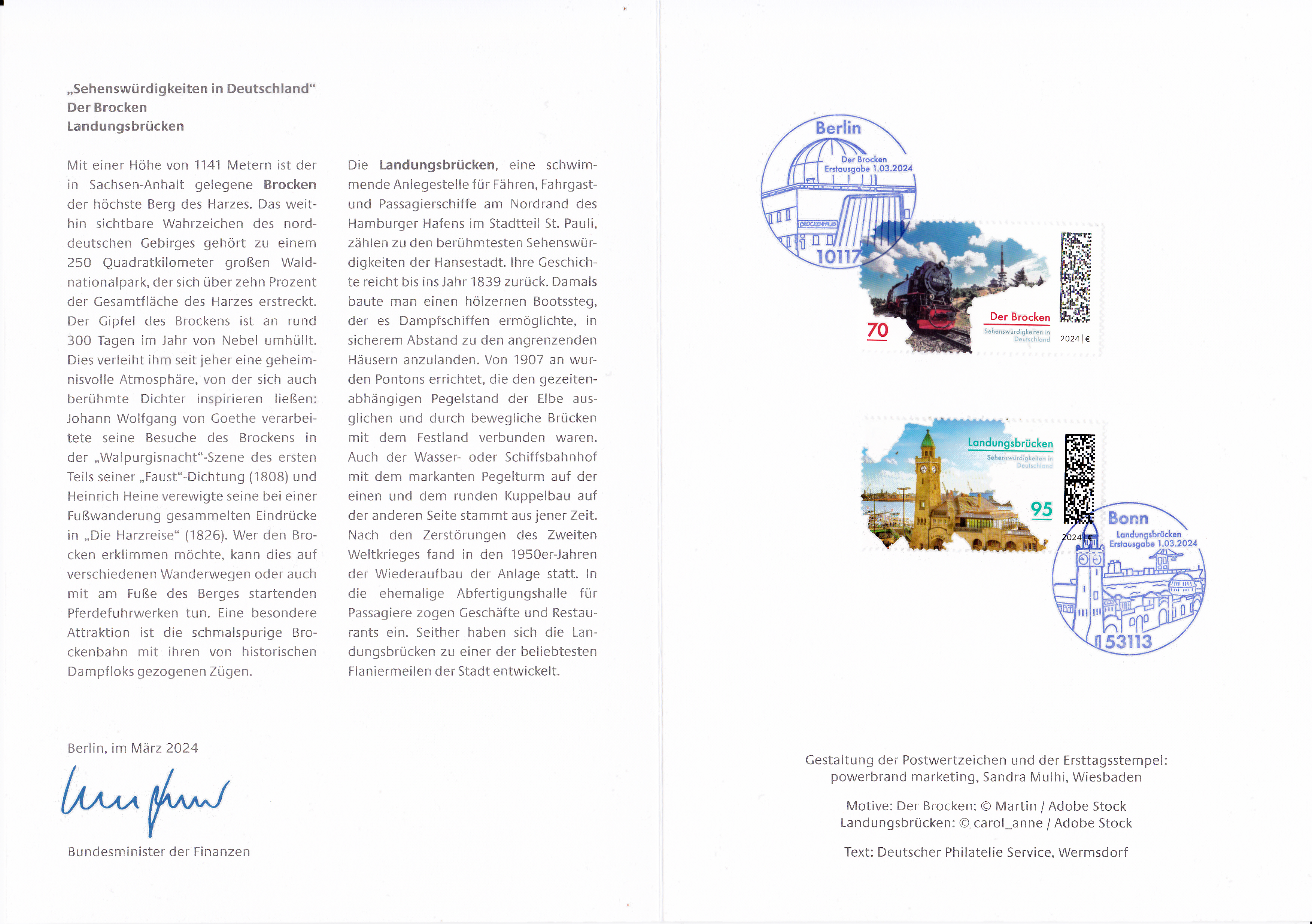 Nun kommen ein paar aktuelle Karten. Ministerkarte des Bundesministers für Finanzen mit je einer Marke "Brocken" (MiNr 3817) und "Hamburger Landungsbrücken" (MiNr 3818) aus der Serie "Sehenswürdigkeiten in Deutschland" und den beiden Ersttagsonderstempel Bonn und Berlin.