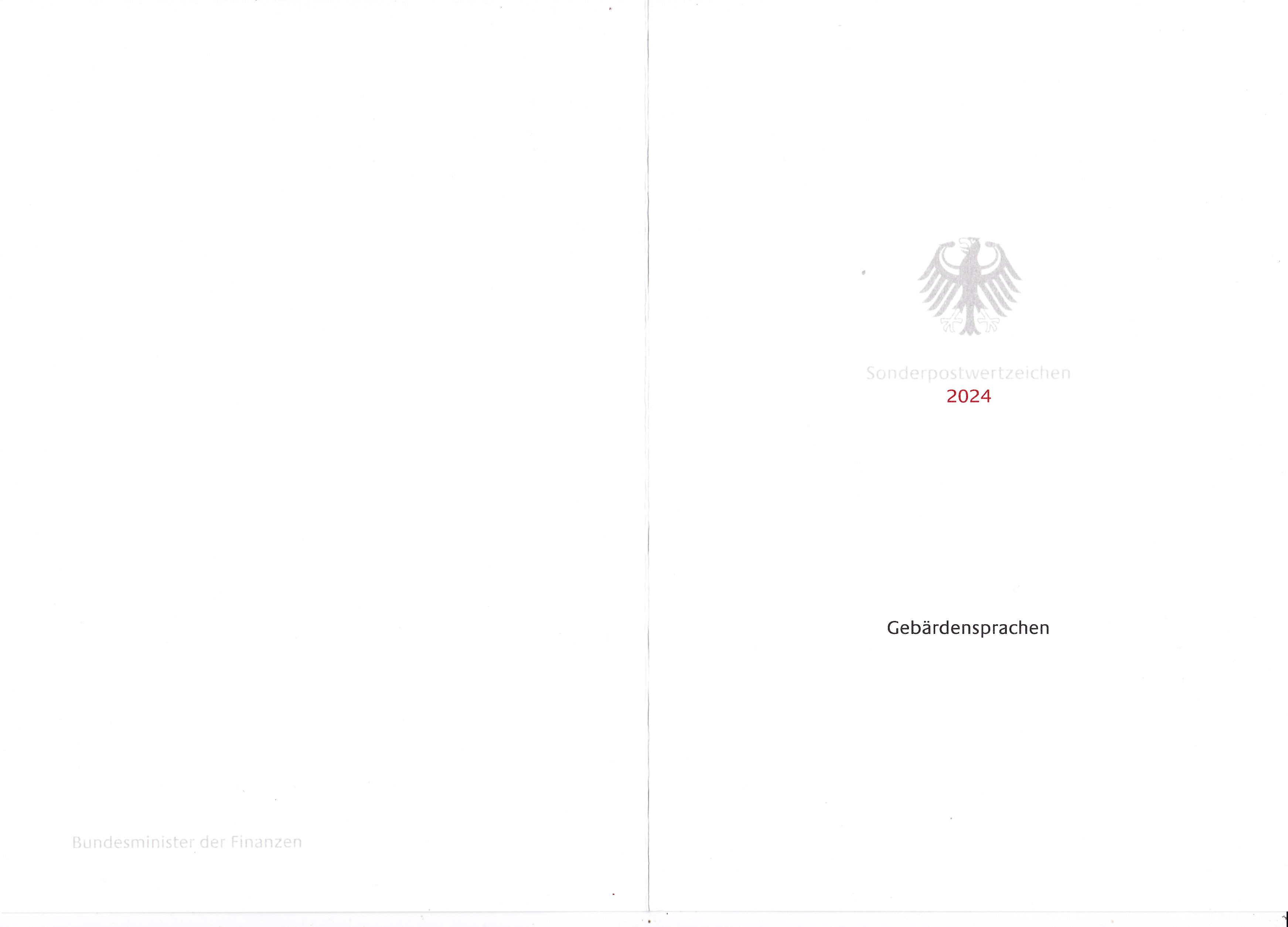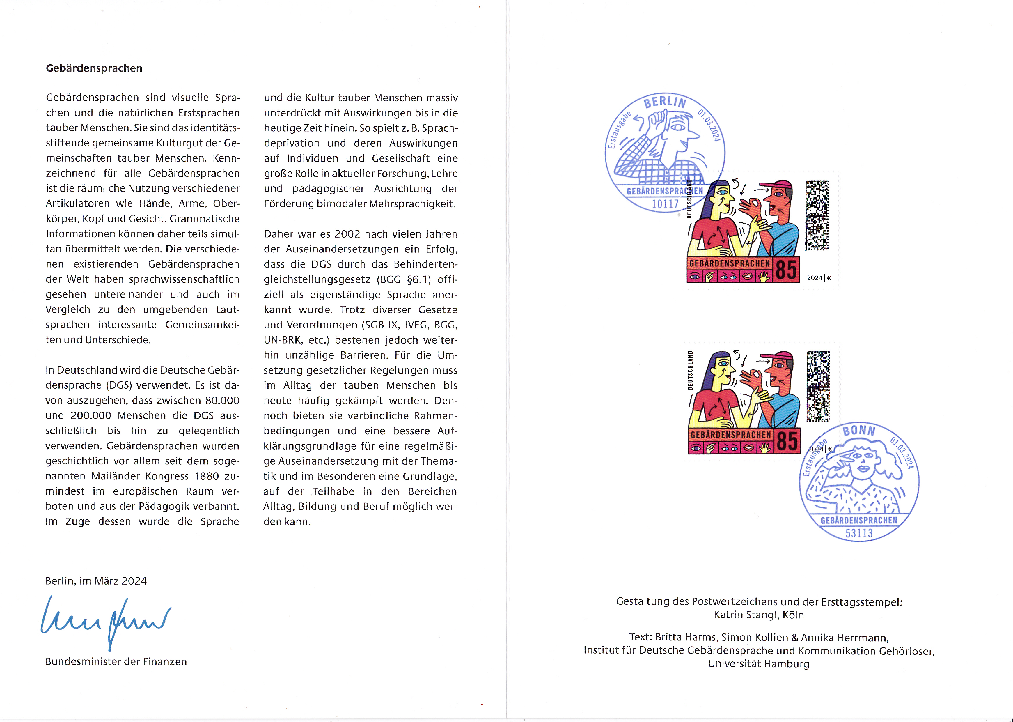 Ministerkarte des Bundesministers für Finanzen mit zwei Marken (MiNr 3819) "Gebärdensprachen" und den beiden Ersttagsonderstempel Bonn und Berlin.