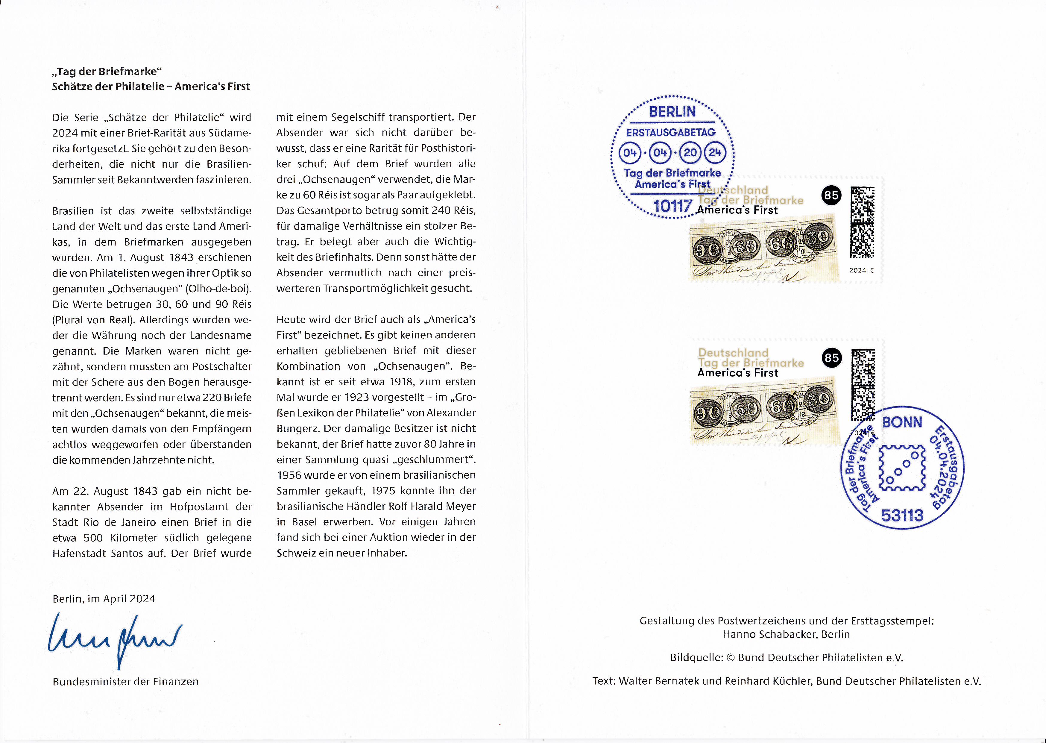 Ministerkarte des Bundesministers für Finanzen mit zwei Marken (MiNr 3822) zum Tag der Briefmarke 2024 und den beiden Ersttagsonderstempel Bonn und Berlin.