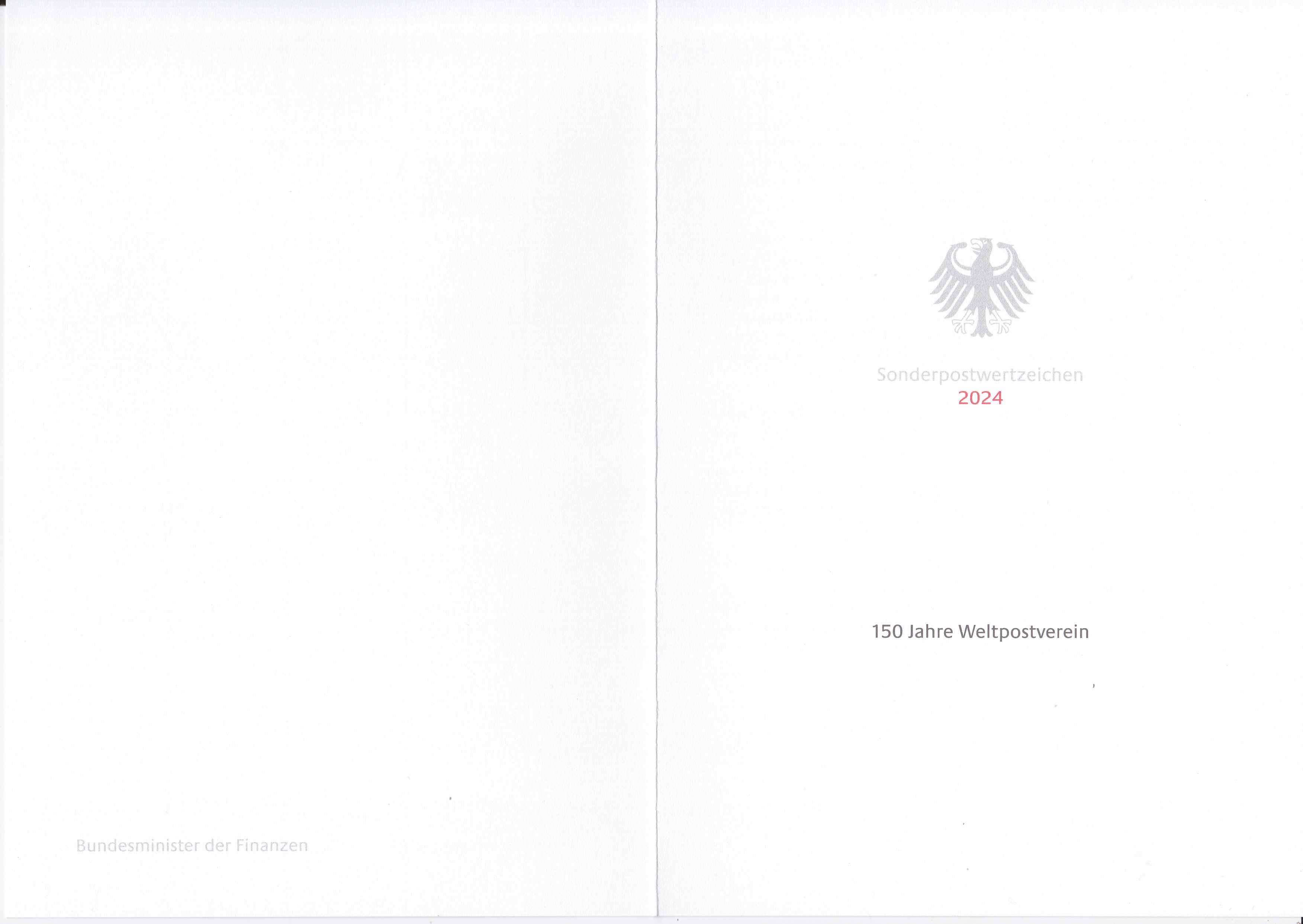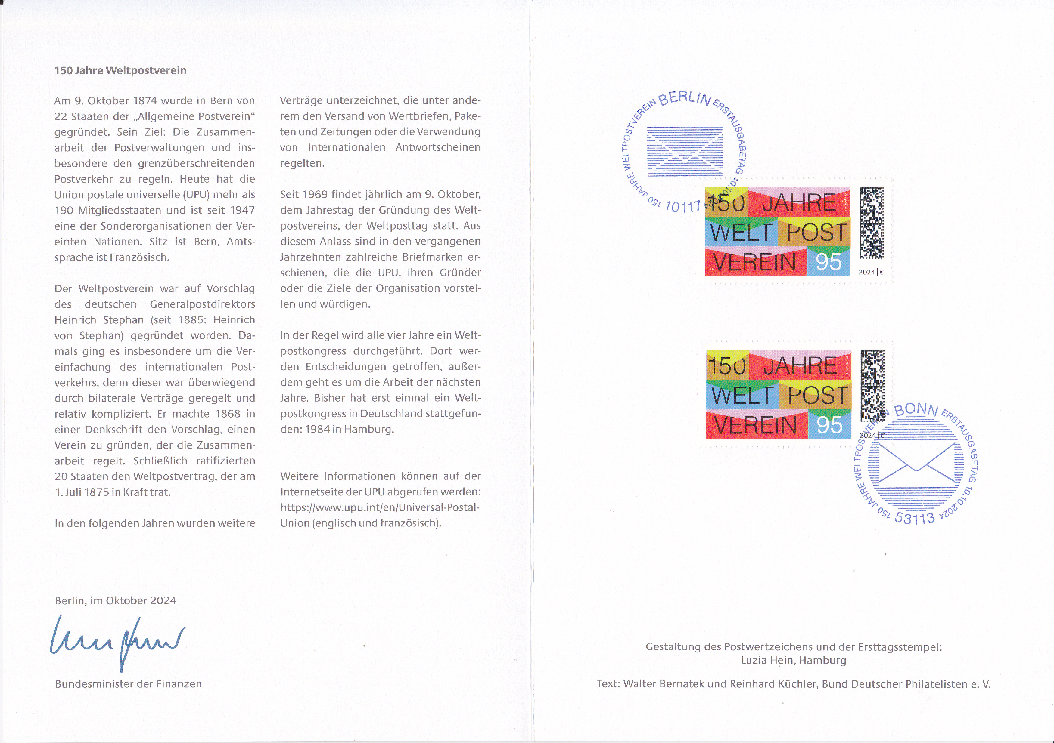 Ministerkarte des Bundesministers für Finanzen mit zwei Marken "150 Jahre Weltpostverein" (MiNr 3857) und den beiden Ersttagsonderstempel Bonn und Berlin.